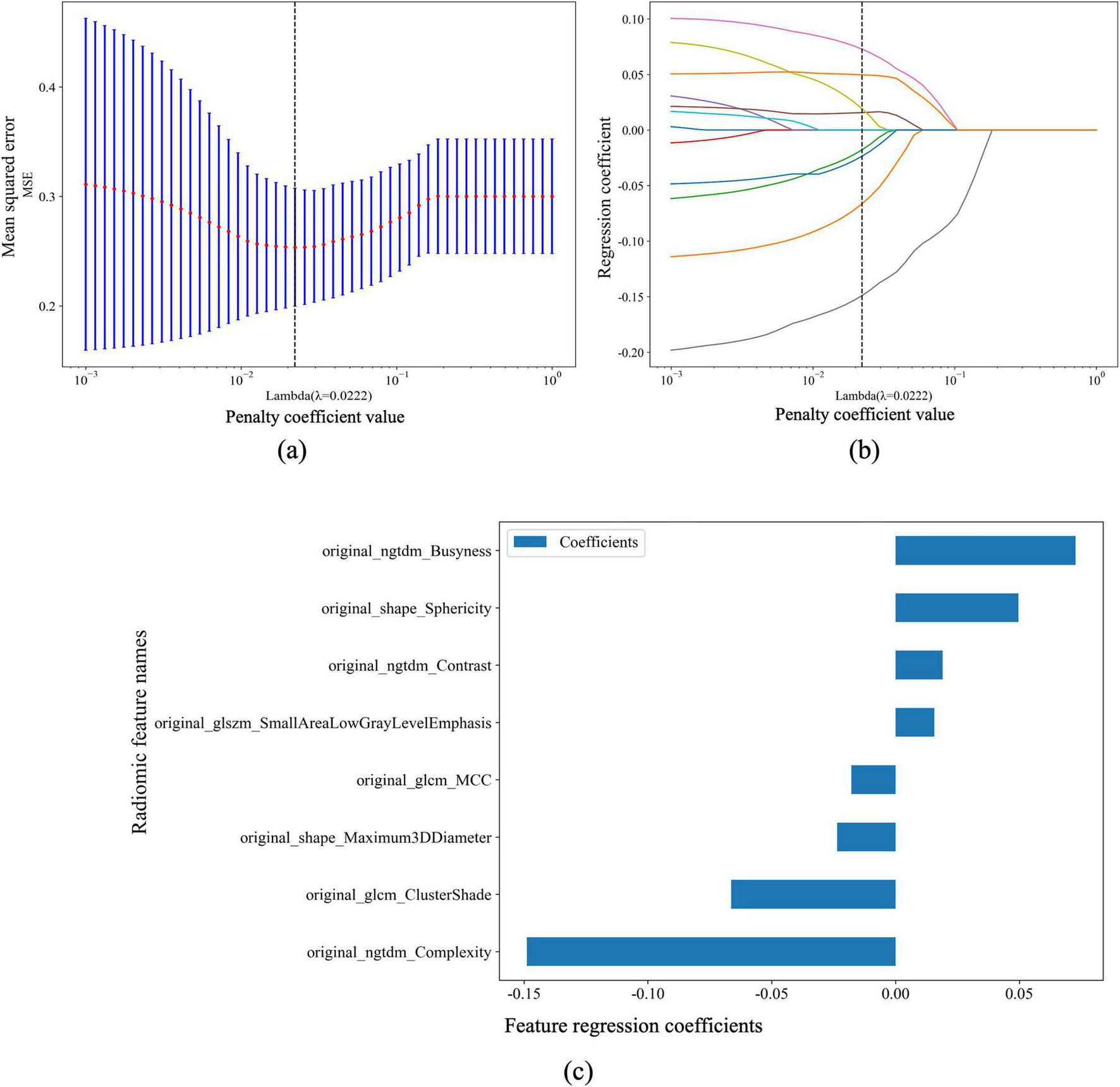 Penalized feature selection and regression coefficients for pneumoconiosis large opacities and peripheral lung cancer classification. (a) The relationship between the penalty coefficient value (λ) and the binomial deviance (Y-axis), with the X-axis showing the corresponding number of features. The vertical dashed line indicates the optimal λ value (λ = 0.0222). (b) The regression coefficients for each feature plotted against the penalty coefficient value (λ), illustrating the shrinkage effect of the penalty term and the evolution of feature coefficients with increasing λ. (c) A horizontal bar chart displaying the selected features with their corresponding regression coefficients. The Y-axis shows the radiomic feature names, and the X-axis represents the magnitude and direction of the coefficients, where bars to the right indicate positive coefficients and those to the left indicate negative coefficients.