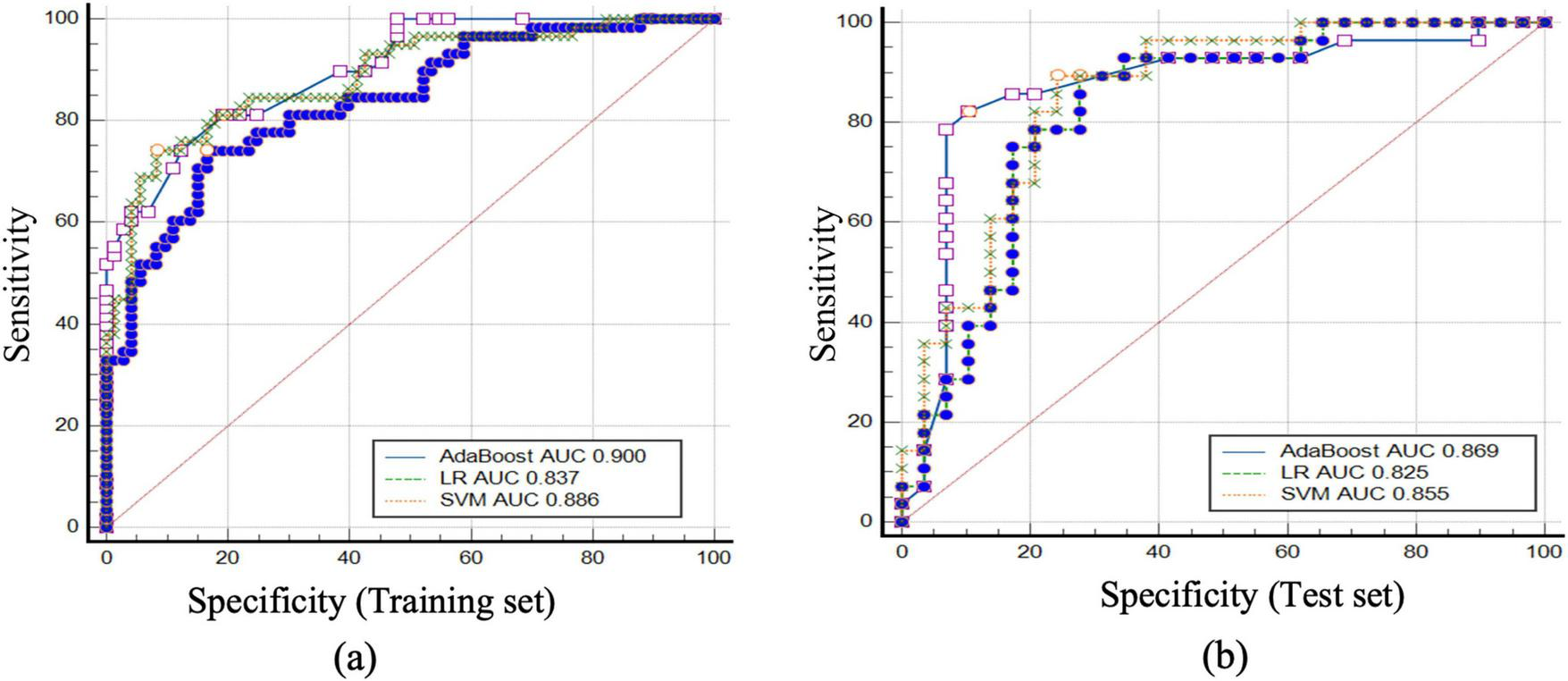 ROC curves and AUC values for the AdaBoost, LR, and SVM models in predicting pneumoconiosis large opacities and peripheral lung cancer in the training and test sets. (a) the ROC curves and corresponding AUC values for the AdaBoost, LR, and SVM models in the training set, with the AUC values for AdaBoost, LR, and SVM being 0.900, 0.837, and 0.886, respectively. (b) the ROC curves and AUC values for the models in the test set, with the AUC values for AdaBoost, LR, and SVM being 0.869, 0.825, and 0.855, respectively. These results demonstrate the performance of each model in differentiating between pneumoconiosis large opacities and peripheral lung cancer, highlighting AdaBoost as the top performer in both the training and test sets.