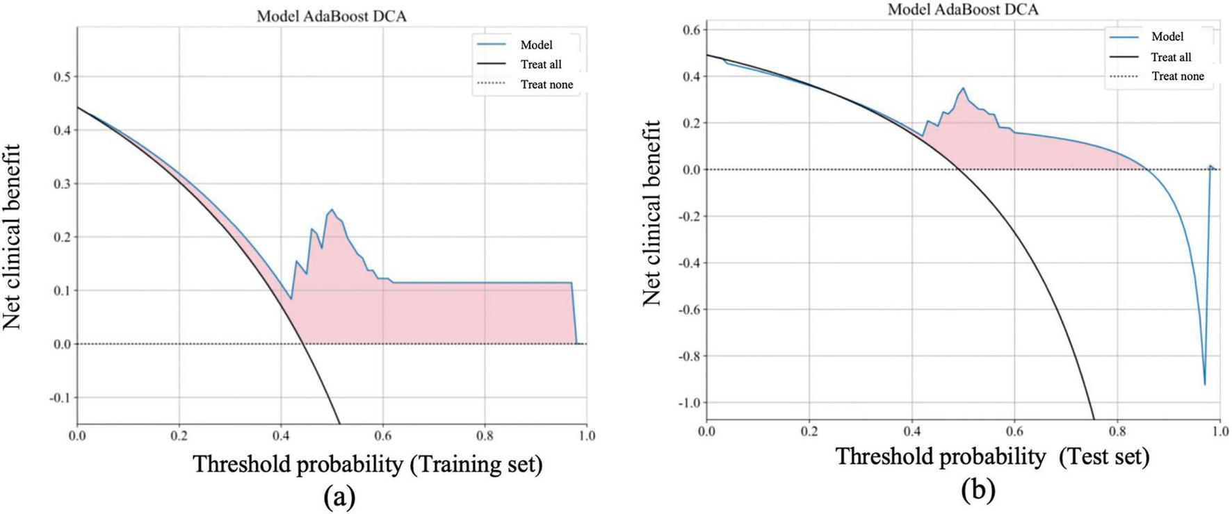 Net benefit of the AdaBoost model in the training and test sets based on DCA Curves, compared with “Treat all” and “Treat none” strategies. The DCA curves for the AdaBoost model, showing the net benefit in both the training (a) and test sets (b) at various threshold probabilities. The net benefit is calculated as the correct decision gain minus the loss from incorrect decisions. The horizontal axis represents the threshold probability, which indicates the minimum probability threshold for classifying a sample as positive. The vertical axis represents the net benefit. The model’s performance (blue line) is compared with the “treat all” (black line) and “treat none” (dashed black line) strategies. The shaded pink area indicates the range where the AdaBoost model provides a higher net benefit compared to both “treat all” and “treat none” strategies. The AdaBoost model demonstrates significantly higher net benefit in the low threshold probability range (0–0.4), indicating its ability to effectively identify patients who require treatment at an early stage. In the moderate threshold range (0.4–0.6), the model still outperforms both the “treat all” and “treat none” strategies, suggesting its predictive value for clinical decision-making.
