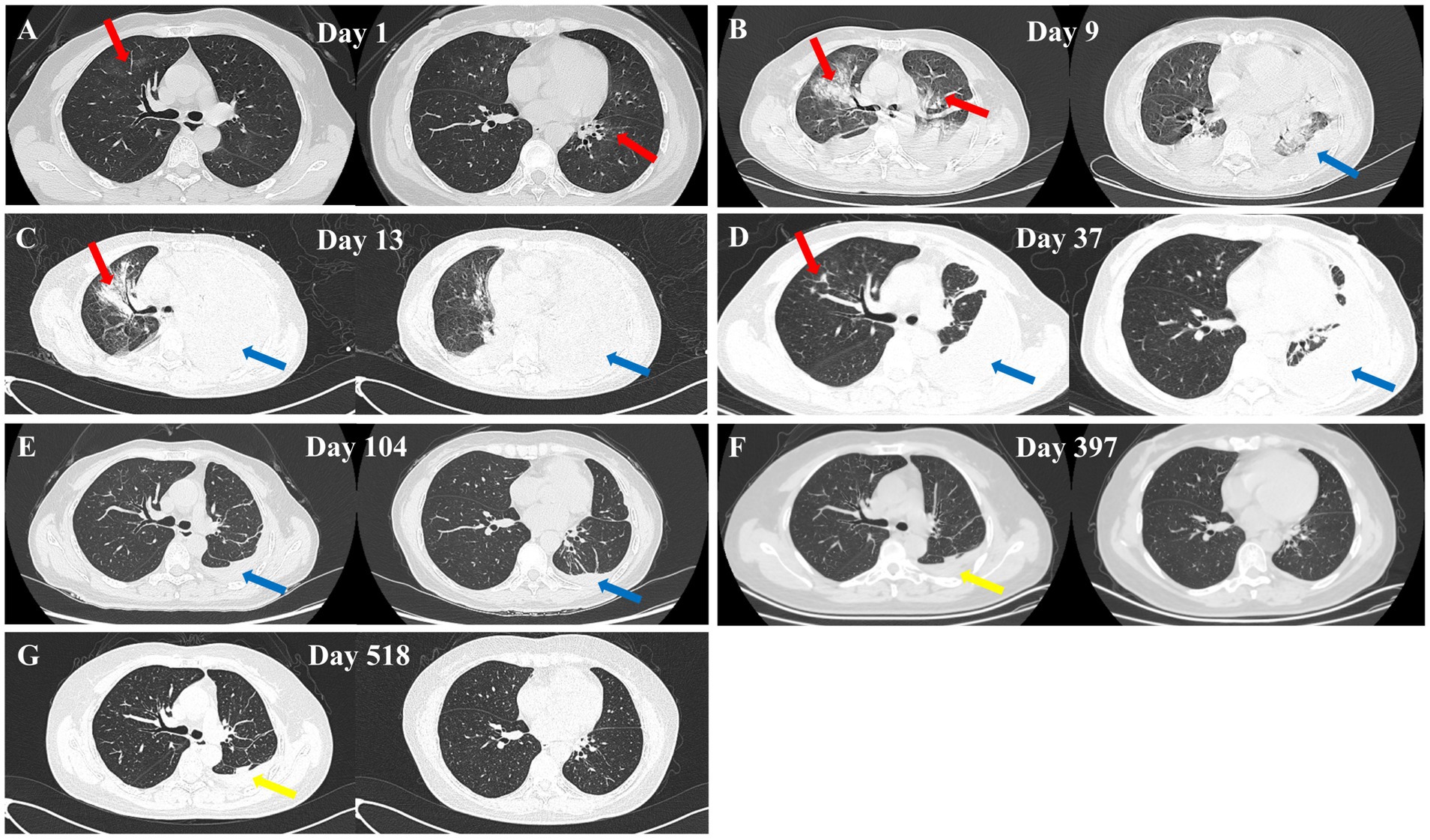 Figure 1. Chest CT images of the patient at different dates. (A) February 7, 2024 – scattered bilateral pulmonary infections (red arrows). (B) February 15, 2024 – multiple bilateral inflammatory lesions (red arrows) and pleural effusion (blue arrows). (C) February 19, 2024 – right lung inflammation (red arrow) and left lung pleural effusion with atelectasis (blue arrows). (D) March 15, 2024 – mild right lung inflammation (red arrow) and left lung pleural effusion with atelectasis (blue arrows). (E) May 21, 2024 – small amount of left-sided pleural effusion (blue arrows). (F) March 11, 2025 – left pleural thickening (yellow arrow). (G) July 9, 2025 – left pleural thickening (yellow arrow).