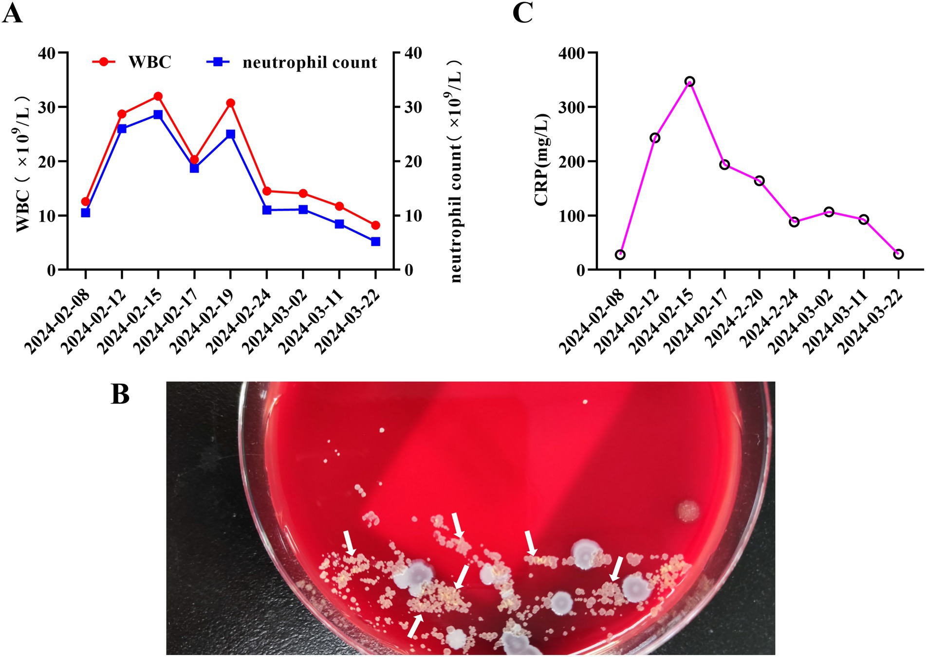 Figure 2. Clinical laboratory indicators and microbiological dvidence. (A)Trend curve of WBC, and neutrophil count during patient hospitalization. (B) Colonial morphology of Nocardia spp. on blood agar plate after 5-day culture of BALF (white arrows). (C) Trend curve of CRP during patient hospitalization.