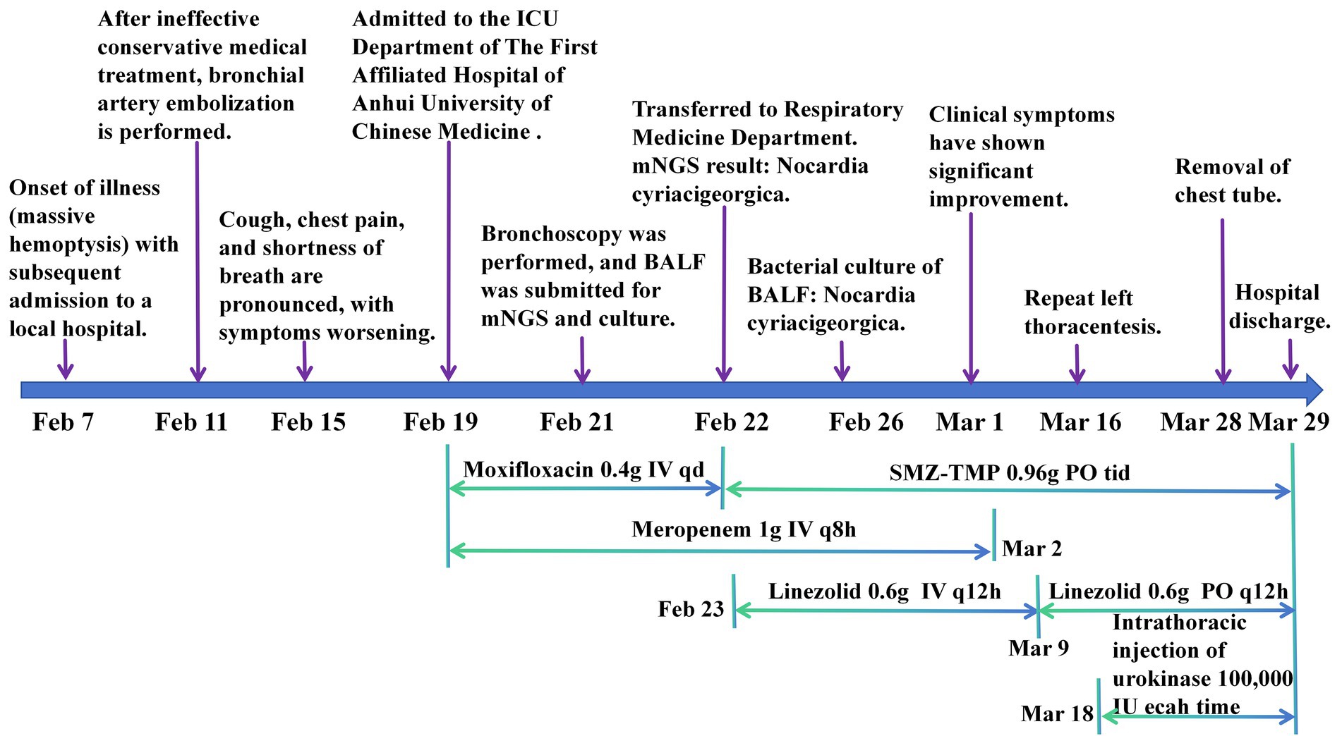 Based on the patient’s clinical presentation, imaging findings, and mNGS results, a definitive diagnosis of pulmonary Nocardia infection was established. Starting February 22, 2024, the patient’s antimicrobial regimen was adjusted to: intravenous meropenem 1 g q8h for 12 consecutive days; oral sulfamethoxazole-trimethoprim (SMZ-TMP) 0.96 g tid for a total treatment duration of 6 months; Linezolid was initially administered intravenously at 0.6 g q12h for 15 days, followed by oral administration at 0.6 g q12h until the completion of the overall antimicrobial therapy regimen (total duration: 6 months). During the patient’s hospitalization, repeated monitoring of WBC, neutrophil count, and CRP showed gradual decreases in values with treatment (Figures 2A,C). On March 15, 2024, a follow-up chest CT revealed significant resolution of right lung lesions and a left-sided encapsulated pleural effusion (Figure 1D). To promote fluid absorption, a repeat thoracentesis was performed on March 16, 2024, with intermittent intrapleural administration of urokinase (100,000 IU per session, totaling 10 sessions). The patient was discharged on March 29, 2024, with recommendations for regular follow-up examinations. The entire treatment course was illustrated in Figure 3.