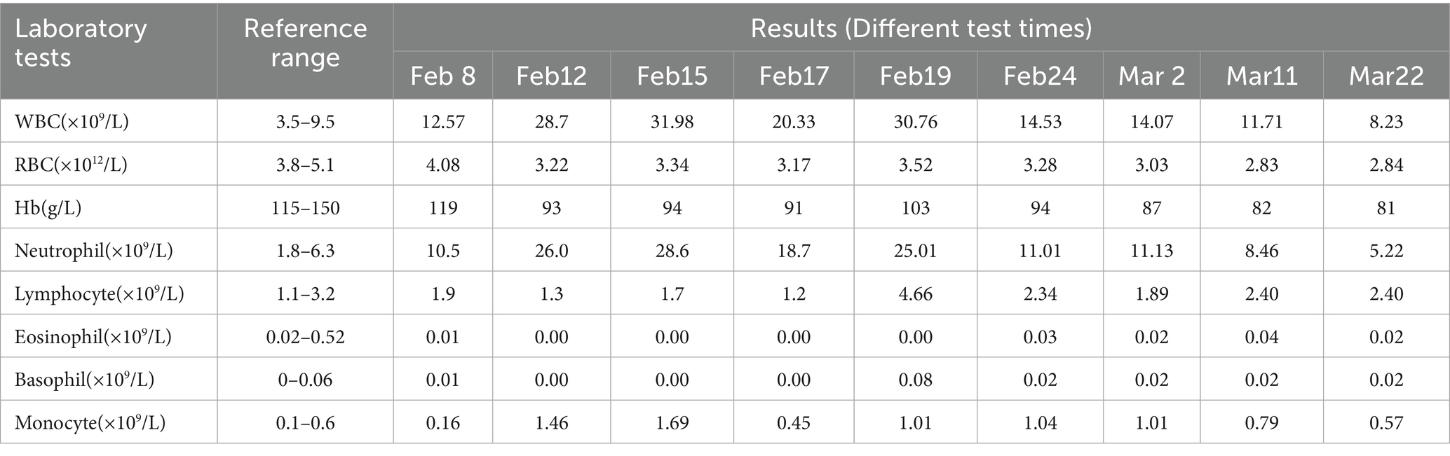 A 55-year-old female farmer was admitted to a local hospital on February 7, 2024, due to sudden massive hemoptysis 12 h. She ceased farming over a decade ago and has not engaged in any work involving contact with soil, humus, or organic waste in recent times. She denied recent travel history, keeping pets, or visiting epidemic areas. She reported no history of smoking or alcohol consumption and no record of immunosuppressant use. Additionally, she had no significant past medical history of chronic obstructive pulmonary disease, asthma, hypertension, diabetes, or other major conditions. Chest CT on the day of presentation revealed localized bronchial dilation in the left lower lobe with scattered infections in both lungs (Figure 1A). On February 8, 2024, the complete blood count showed a white blood cell count (WBC) of 12.57 × 109/L (reference range: 3.5–9.5 × 109/L), neutrophil count of 10.5 × 109/L (reference range: 1.8–6.3 × 109/L), neutrophil percentage of 83.60%(reference range: 40–75%), red blood cell count (RBC) of 4.08 × 1012/L(reference range: 3.8–5.1 × 1012/L) (Table 1; Figure 2A). Preliminary diagnosis: bronchiectasis with hemoptysis. The patient received conservative management but it did not resolve the symptoms, and thus, bronchial artery embolization was conducted on February 11, 2024. Subsequently, post-procedure hemoptysis resolved, however, the patient still presented with worsening symptoms of cough, chest pain, and dyspnea, accompanied by low-grade fever. A repeat CT was performed on February 15, 2024 uncovered marked disease progression characterized by bilateral patchy consolidations and pleural effusions (Figure 1B). By February 19, 2024, the patient presented with altered mental status and was transferred to the ICU of The First Affiliated Hospital of Anhui University of Chinese Medicine.