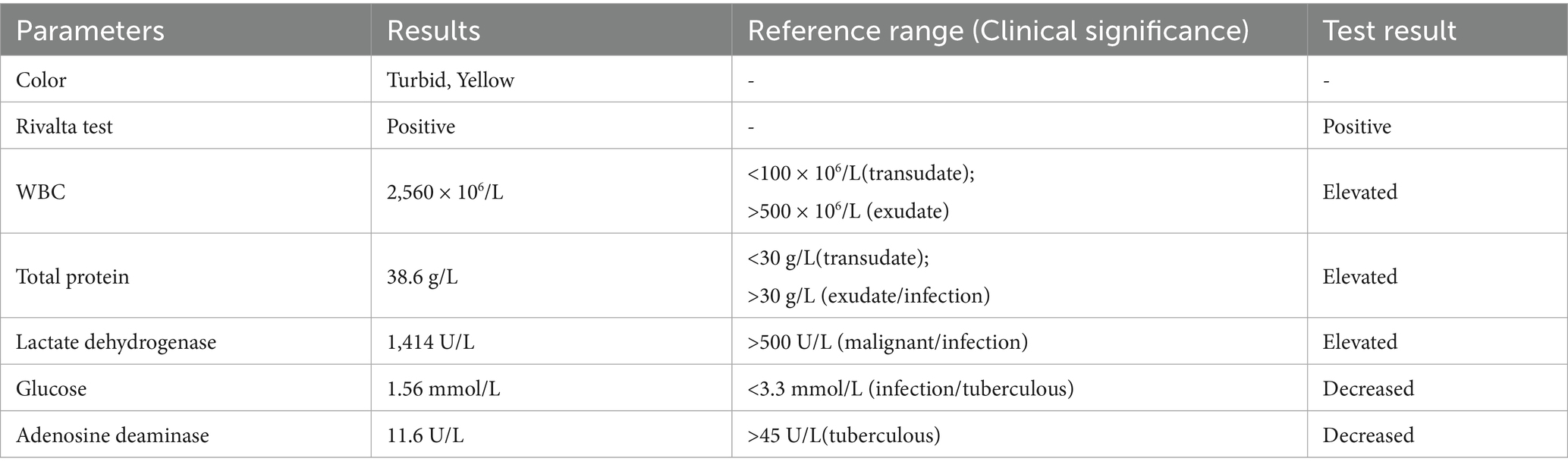 Repeated blood tests revealed markedly elevated WBC, neutrophil count, and CRP levels, indicating a strong inflammatory response consistent with literature reports (7, 14). However, these laboratory markers also lack specificity. In this case, Table 1 showed that an immunocompetent patient with pulmonary Nocardia cyriacigeorgica infection exhibited markedly elevated WBC, neutrophil count, and monocyte count. As antimicrobial therapy progressed, WBC, neutrophil, and monocyte counts gradually returned to normal ranges, indicating effective control of the infection. Lymphocyte fluctuations were minimal, potentially reflecting differences between immunocompetent and immunosuppressed patients. Eosinophil counts remained persistently below the lower normal limit throughout the course, suggesting this infection was not allergy- or parasite-related. However, PN chest imaging also presents with diverse manifestations, including patchy opacities, nodular shadows, consolidation, nodules, masses, cavities, pleural thickening, and pleural effusion (15). These findings lack specific changes. When combined with nonspecific clinical symptoms, they frequently lead to misdiagnosis or missed diagnosis, often being mistaken for pulmonary tuberculosis, pulmonary fungal infections, or tumors. Notably, the pleural effusion reported in this case was encapsulated pleural effusion, consistent with findings in some literature reports (16). Pleural fluid analysis revealed markedly elevated WBC, total protein, and lactate dehydrogenase, characteristic of an exudative infectious effusion. These findings suggest that Nocardia cyriacigeorgica exhibits strong pleural invasiveness, involving both the pleura and pleural cavity. After local intrapleural administration of the drug, the effusion was completely reabsorbed. This suggests that in clinical practice, patients with rapidly progressing pulmonary infection complicated by pleural effusion should undergo active pleural fluid aspiration for diagnostic testing.