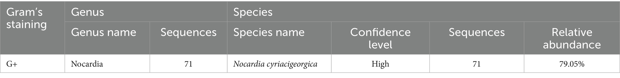 On February 19, 2024, during the patient’s visit to our hospital, the physical examination revealed an axillary temperature of 37.4 °C (normal range: 36–37 °C), blood pressure of 120/75 mmHg (normal: <120/80 mmHg), pulse rate of 93 beats per minute (normal: 60–100 bpm), respiratory rate of 33 breaths per minute (normal: 12–20 bpm), and peripheral blood oxygen saturation of 90% (normal: ≥95%). Auscultation detected diminished breath sounds over the left lung and scattered dry/wet rales over the right lung. Emergency blood tests revealed the following results: WBC of 30.76 × 109/L, neutrophil count of 25.01 × 109/L, neutrophil percentage of 81.30%, and RBC of 3.52 × 1012/L. Pulmonary Artery Computed Tomography Angiography did not show any pronounced abnormalities. Results of the Chest CT demonstrated patchy high-density opacities in the right lung and a large left pleural effusion (Figure 1C). On the same day, a left-sided thoracentesis and drainage procedure was performed to collect pleural fluid samples for further analysis (Table 2). Given the rapid progression of the condition, a broad-spectrum antibiotic regimen consisting of meropenem and moxifloxacin was administered. Considering the potential presence of a specific pathogen infection, bronchoscopy was performed on February 21, 2024, to collect a BALF sample for mNGS analysis. On February 22, 2024, the patient showed signs of improvement, including regaining consciousness, fever subsiding, decreased respiratory rate, and relief of respiratory distress symptoms. Consequently, she was transferred from the intensive care unit to the respiratory medicine ward. Concurrently, the February 22, 2024, mNGS detected Nocardia cyriacigeorgica in BALF (Table 3), which was further confirmed through bacterial culture (Figure 2B). Other tests such as blood cultures, TB assays, viral/fungal panels, pleural fluid culture were negative.