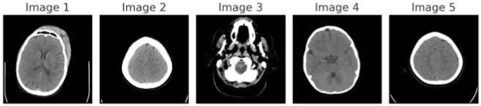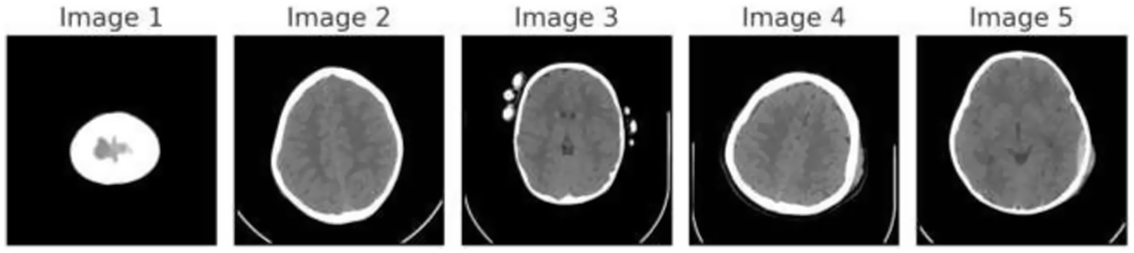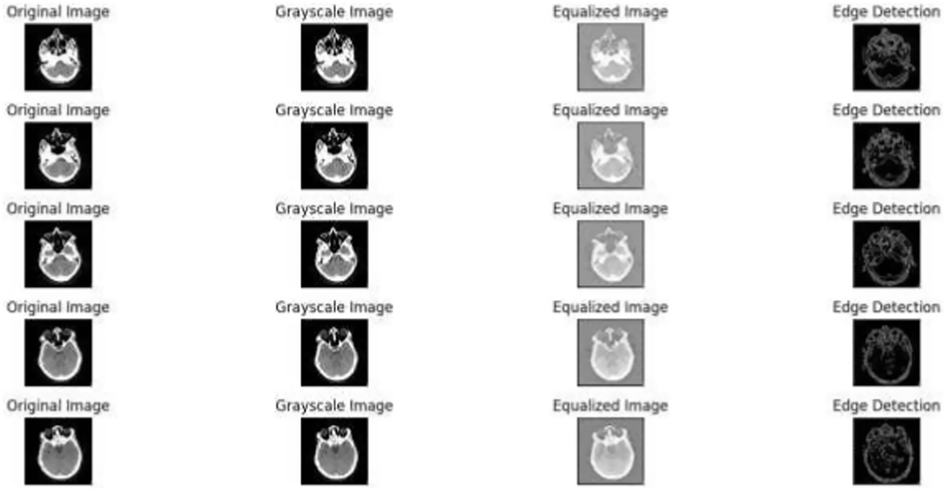 Figure 1 demonstrates the unprocessed and processed CT scan brain scans. Raw images are initially scanned, whereas the processed ones have undergone a procedure of removing noise and normalization to facilitate analysis. Figure 2 shows grayscale, equalized, and edge-detected images of the preprocessed brain images. Gray levels eliminate color, equalization increases contrast, and edge detection emphasizes boundaries of key structures. The CT scan cross-sections shown in Figure 3 are used to obtain details about brain structure and the parts prone to abnormalities such as strokes and tumors. Figure 4 shows different CT scan cross-sections with varying types of stroke, and how ischemic and hemorrhagic strokes can be represented in the brain in a cross-section.