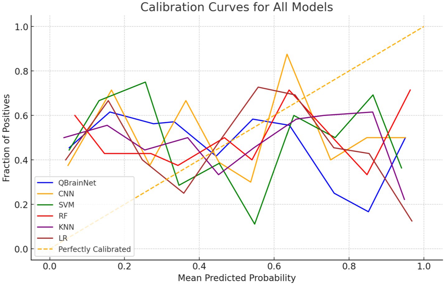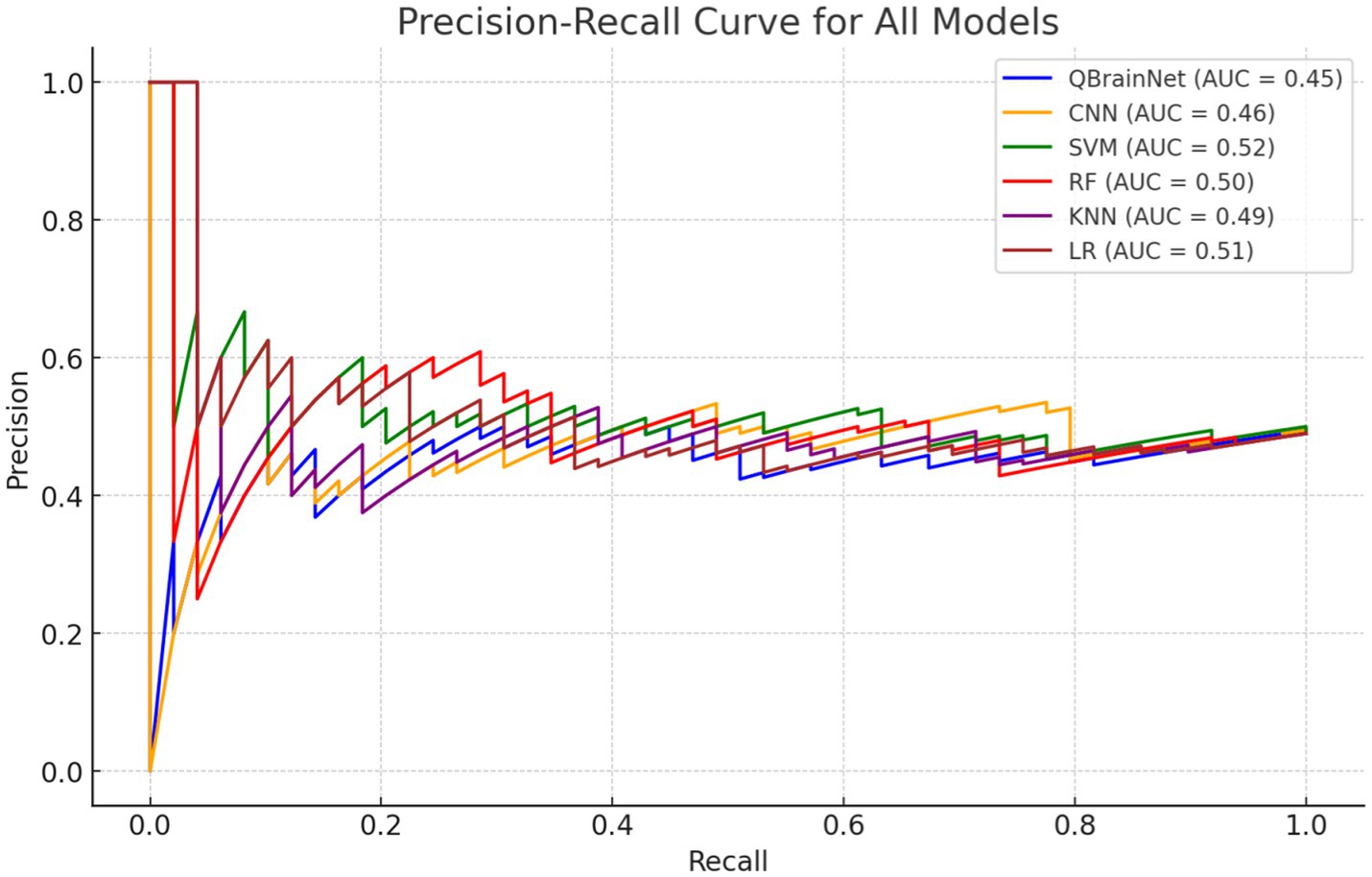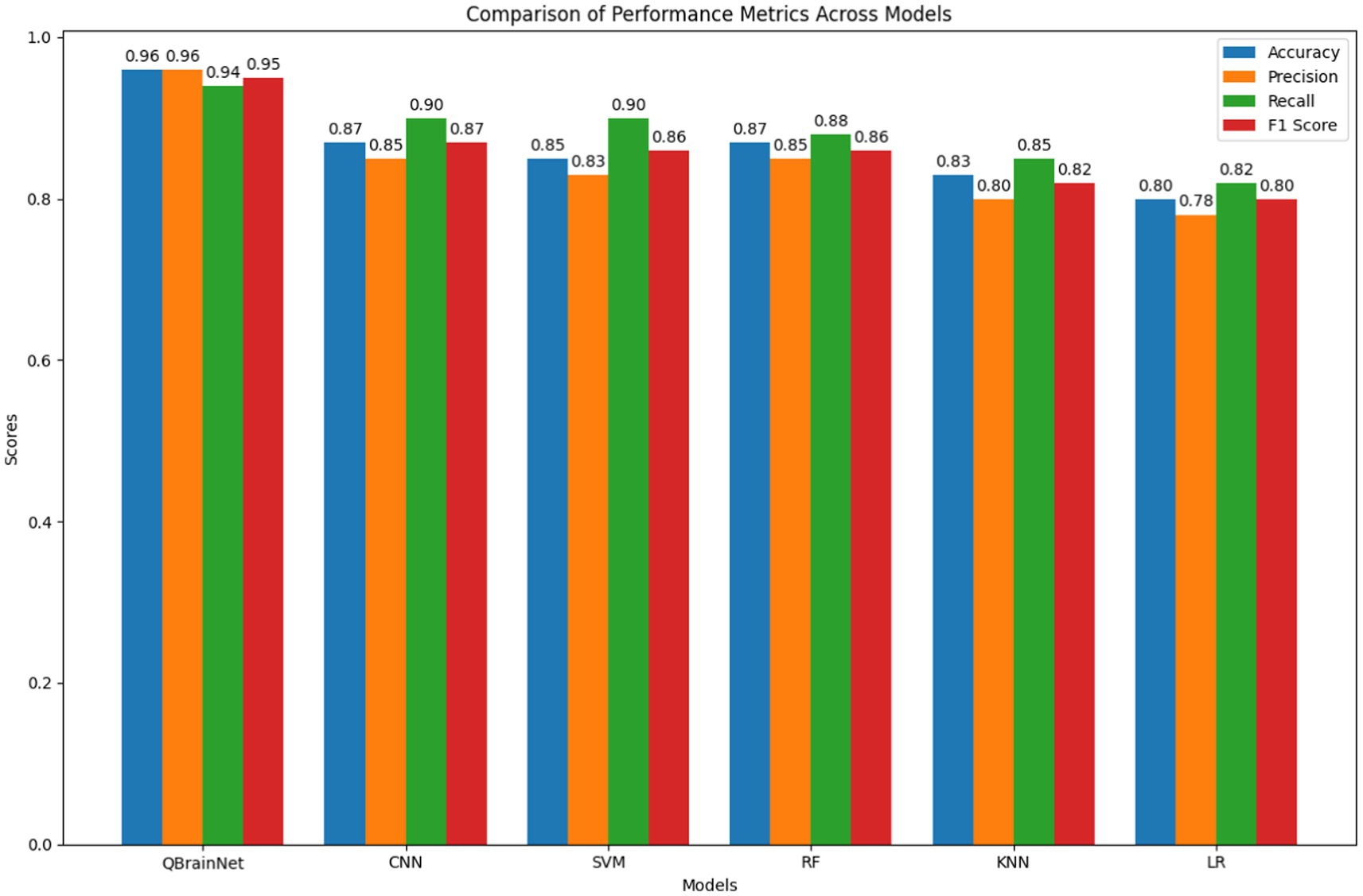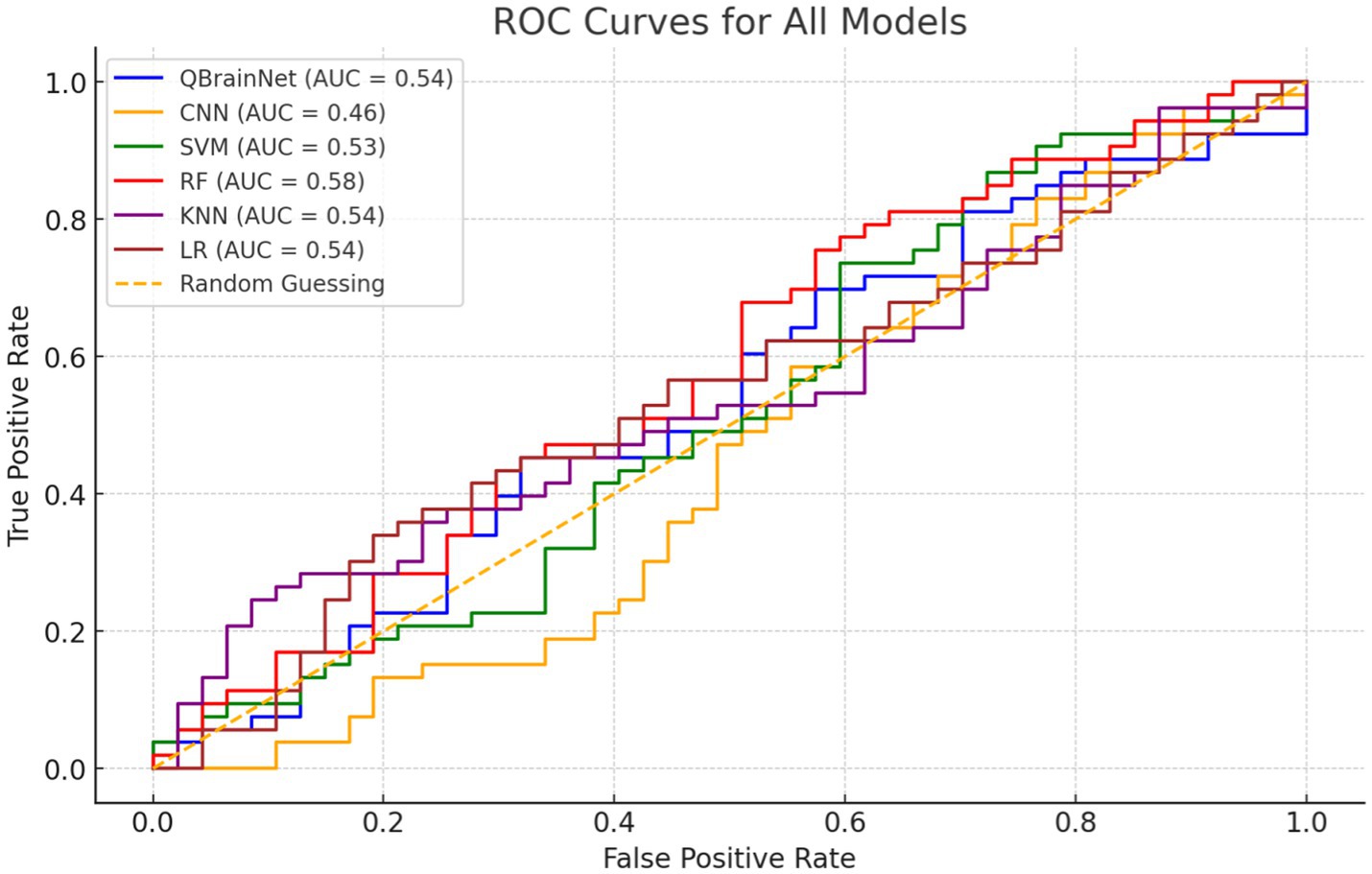 Comparison of QBrainNet, CNN, SVM, RF, KNN, and LR is performed in ROC Curves (Figure 15). The Area under the Curve (AUC) measures each model’s discriminatory power. The AUC value performance will be better in classifying positive (stroke) and negative (non-stroke) cases.