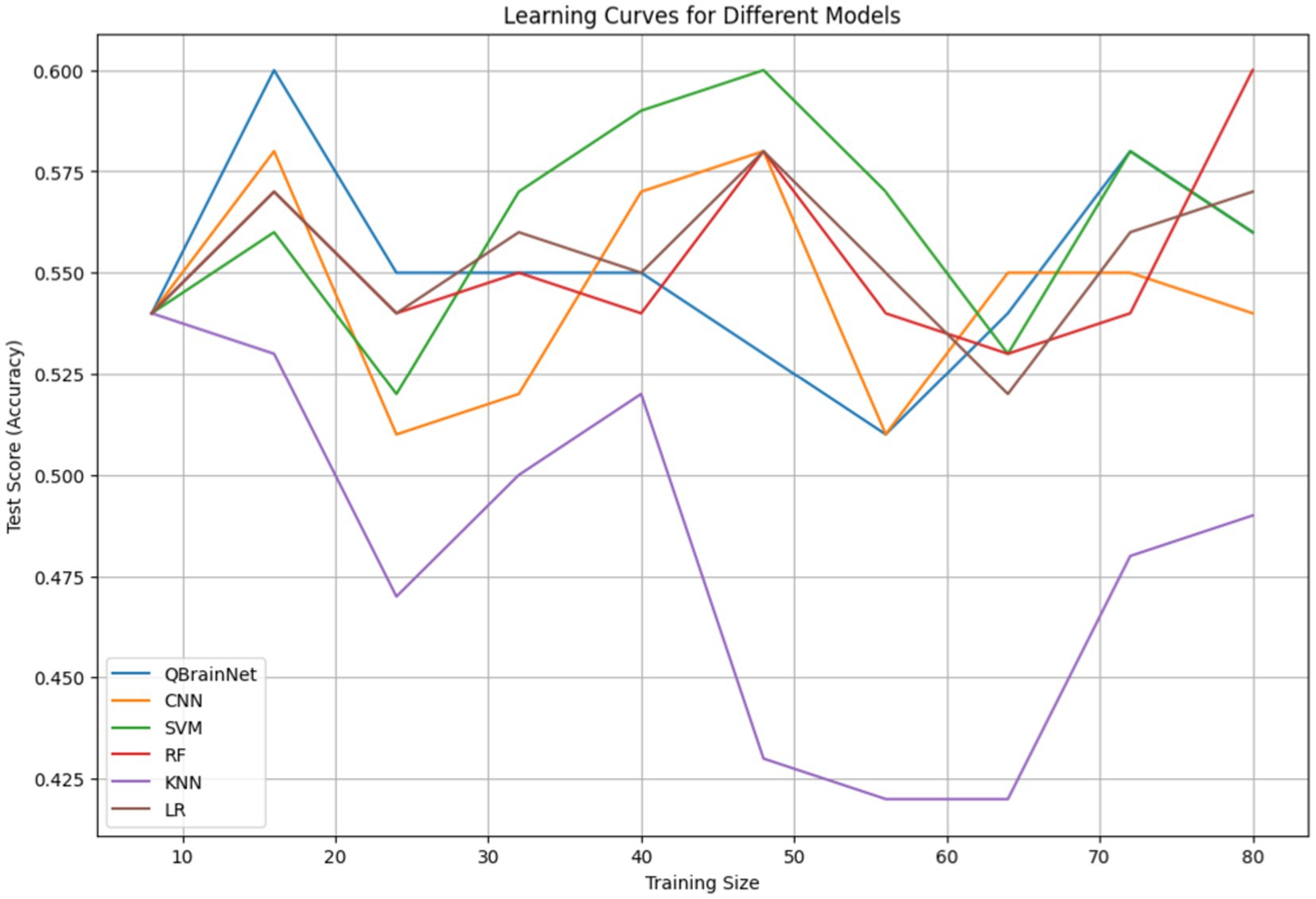 Figure 16 shows the Learning Rate vs. Performance graph, which also shows how other models, such as CNN, SVM, RF, KNN, and LR, perform with different learning rates and how QBrainNet’s performance varies over that. Hyperparameter tuning is shown to have a great effect on each model’s performance, particularly the learning rate.