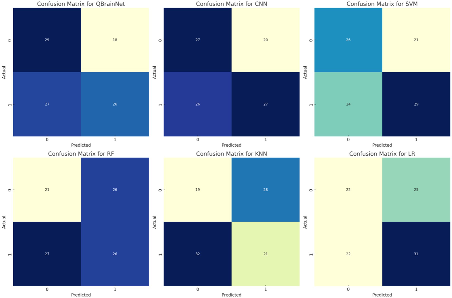 Examining the matrices reveals that QBrainNet performs far ahead of the other models, with a larger number of true positives, which demonstrates its ability to identify stroke cases accurately. Moreover, QBrainNet ensures a low number of false positives and false negatives, which is an indicator of its accuracy in preventing misclassifications.