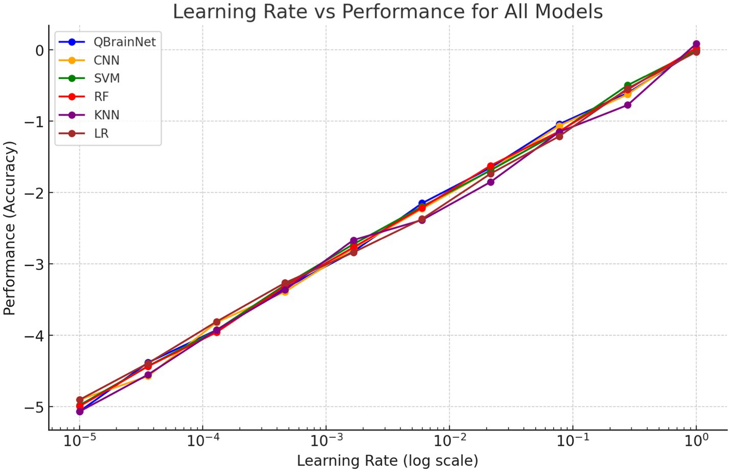 Results indicate that the performance of QBrainNet was more consistently improved when the learning rate was tuned. That means QBrainNet is more adapted to the hyperparameters and more efficient than the rest of the models. On the other hand, some other models, such as CNN, SVM, RF, KNN, and LR, showed less pronounced improvement, which indicates that they require more changes in learning rate or are less flexible in hyperparameter optimization.