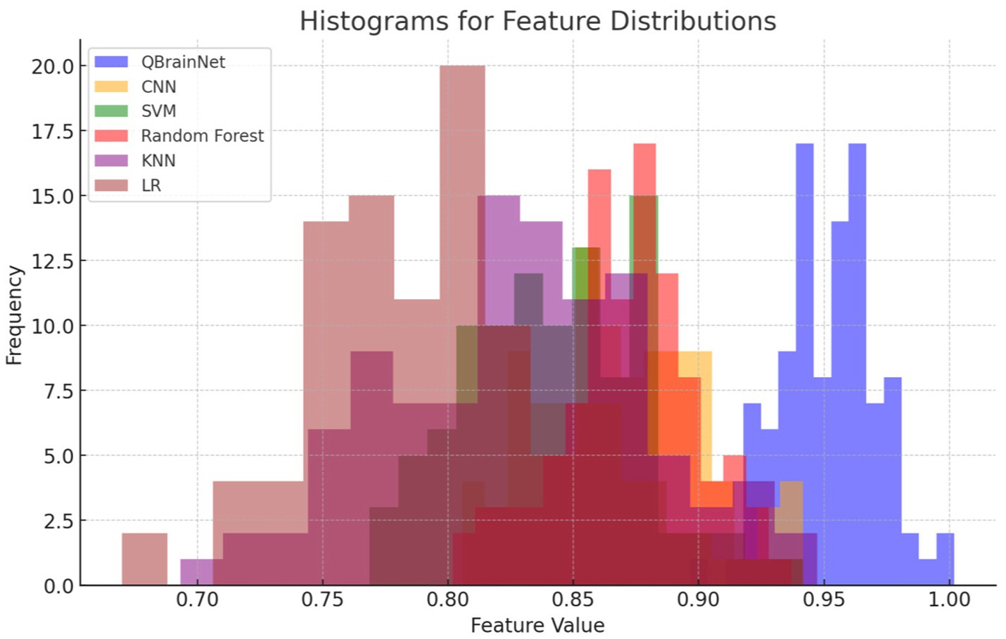 The Histogram for Feature Distributions (Figure 17) shows the distribution of feature values for QBrainNet, CNN, SVM, RF, KNN, and LR. The difference in QBrainNet is that it concentrates on feature value at the higher end, indicating it is more dependent on features. Other models, for example, CNN, SVM, and RF, have overlapping distributions, and KNN and LR have less clear peaks. This visualization shows the different ranges of features for each model to be used for prediction.