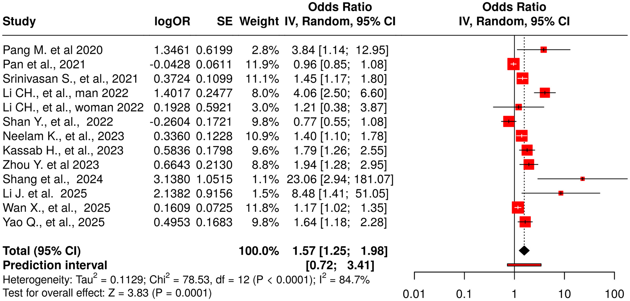 All statistical analyses were conducted using R Studio version 4.5.0 (RStudio, PBC, Boston, MA, USA) with the meta, metafor, and dmetar packages. Pooled effect sizes (ORs, HRs, or RRs) were calculated with 95% CIs using fixed-effects models when heterogeneity was low (I2 ≤ 50%) and random-effects models when heterogeneity was substantial (I2 > 50%). Predefined subgroup analyses were conducted by study design (cohort, cross-sectional), sample size, year, and gender. To further explore sources of heterogeneity, meta-regression was performed using covariates such as mean age, sample size, year and gender. Sensitivity analyses were conducted using a leave-one-out method to evaluate the robustness of the pooled estimates. Publication bias was assessed using funnel plot visualization and Egger's regression test, with p-values less than 0.10 considered indicative of potential bias (18).