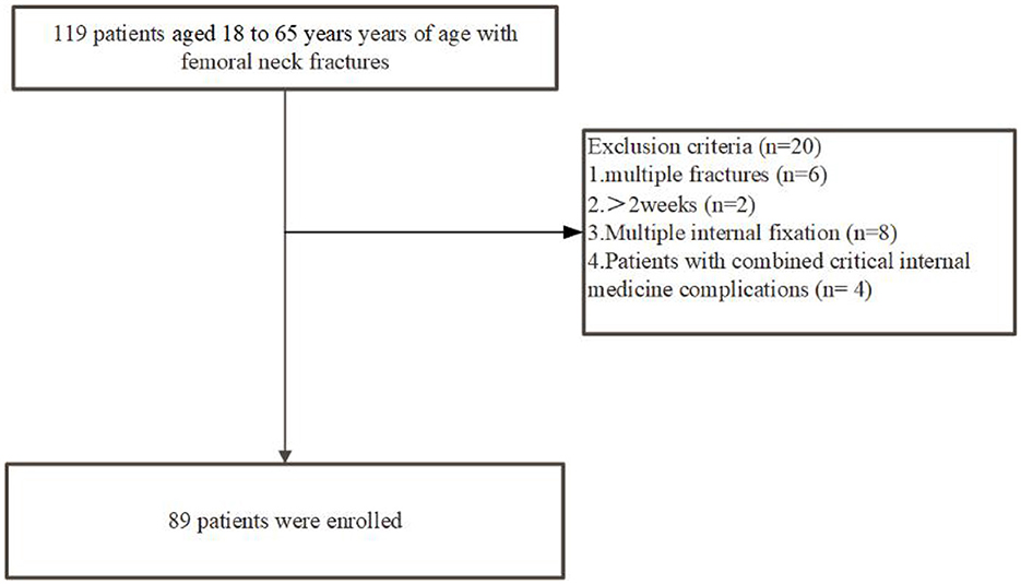 This retrospective cohort study analyzed data from 89 patients aged 18 to 65 years with femoral neck fractures who were treated at Fuzhou Second General Hospital between September 2019 and November 2021. Data were collected from the hospital's electronic medical records, medical imaging system, laboratory information system, and follow-up records, with a minimum follow-up period of 6 months. The inclusion and exclusion criteria are summarized in Figure 1.