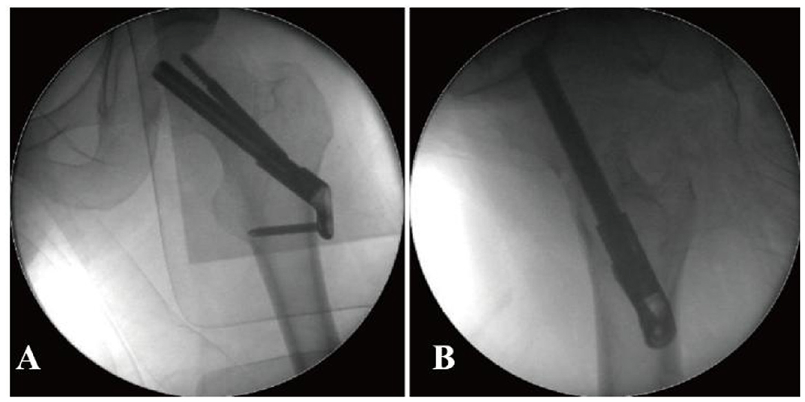 If the femoral neck still exhibited anterior angulation deformity on the lateral C-arm X-ray view, a top bar was placed at the outer edge of the femoral artery (aligned with the projection line of the Smith-Peterson incision). The top bar was applied to the distal end of the femoral neck fracture line, and backward pressure was applied to correct the residual anterior angulation and backward inversion of the femoral head. Simultaneously, the assistant assisted in the reduction according to fluoroscopic images, combined with longitudinal traction of the affected limb, internal rotation, internal retraction, or abduction of the lower limb. Once the fracture was satisfactorily reduced, two pre-positioned Kirschner pins were inserted for temporary fixation of the fracture ends, and the Schanz nails were removed.
