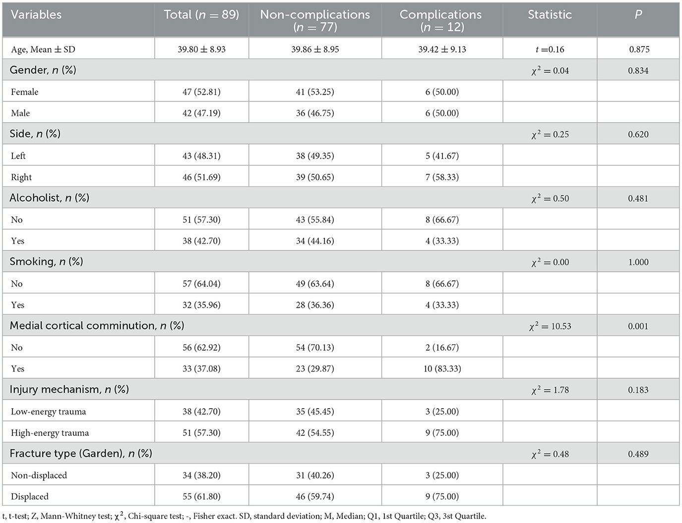 Initially, 119 patients with femoral neck fractures were enrolled; 20 were excluded during follow-up, leaving 89 for the final analysis. Twelve patients (13.5%) were assigned to the complication group and 77 (86.5%) to the non-complication group. The cohort comprised 42 men (47.2%) and 47 women (52.8%) with a mean age of 39.8 ± 8.9 years. No significant between-group differences were observed in age, sex, affected side, BMI, or smoking/alcohol history (P > 0.05), indicating balanced baseline characteristics. The overall mean fracture-healing time was 10.06 ± 0.52 weeks.