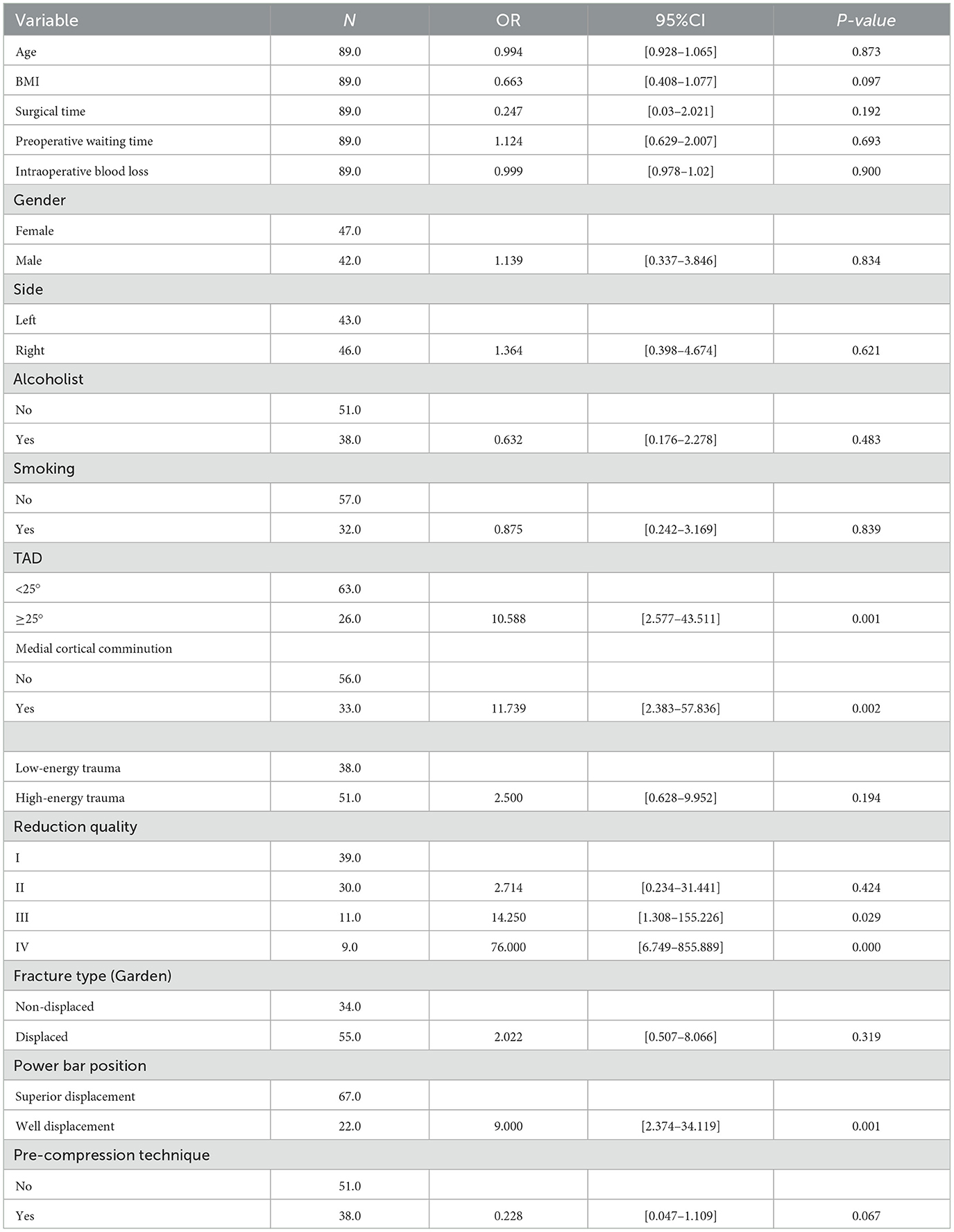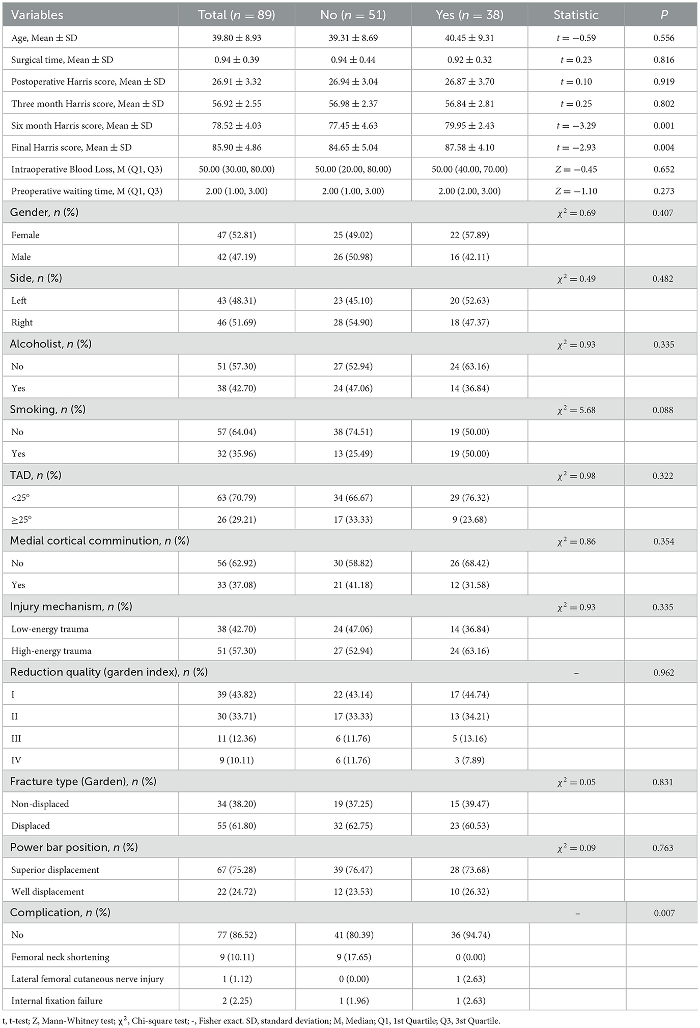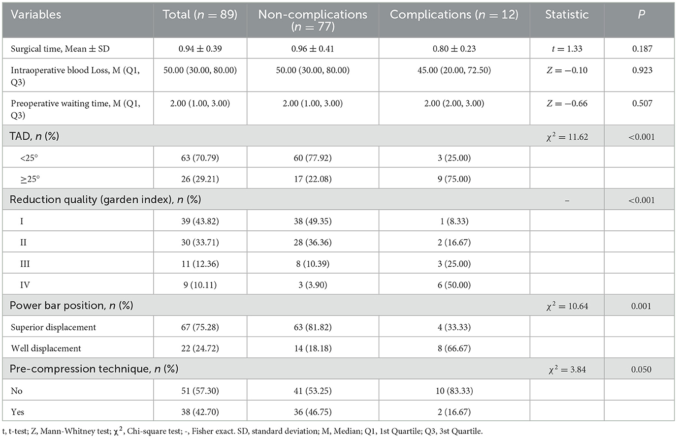 Intraoperative data are shown in Table 2. The mean operative time for all patients was 0.94 ± 0.39 min, the preoperative waiting time was 2 (1–3) days, and the estimated blood loss was 50 (30–80) ml; none of these parameters differed significantly between the two groups. TAD ≥ 20° was observed in 9 (75.0%) patients in the complication group vs. 17 (22.1%) in the non-complication group, with a statistically significant difference (P < 0.001). Regarding reduction quality, Garden grade III was found in 3 (25.0%) vs. 8 (10.4%) patients, and Garden grade IV in 6 (50.0%) vs. 3 (3.9%) patients, respectively; both comparisons were statistically significant (P < 0.001). Superior power-bar placement was recorded in 4 (33.3%) vs. 63 (81.8%) patients, showing a significant difference (P < 0.001). The pre-sliding technique was used in 2 (16.7%) vs. 36 (46.8%) patients, with a statistically significant difference (P = 0.050).