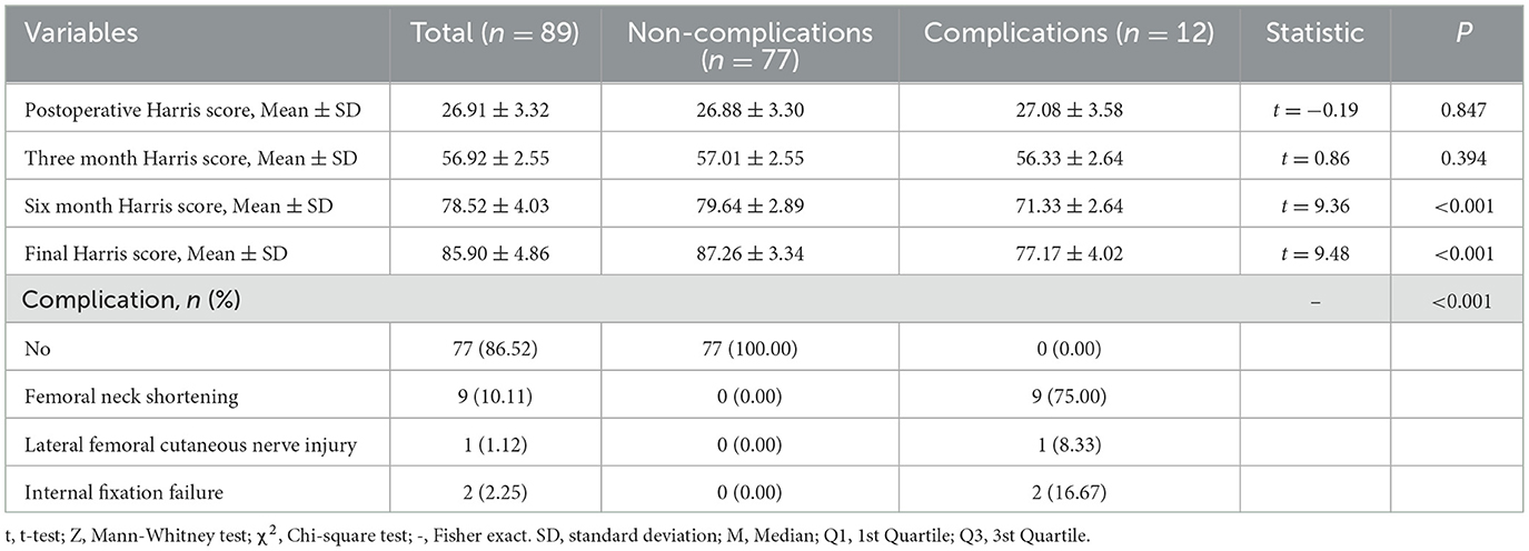 Complication data showed: A total of 12 patients (13.5%) experienced complications, and 77 patients (86.5%) did not experience complications (Table 3). The incidence of femoral neck shortening was 10.1% (9 cases); the incidence of lateral femoral cutaneous nerve injury was 1.1% (1 case), and the incidence of internal fixation failure was 2.2% (2 cases).