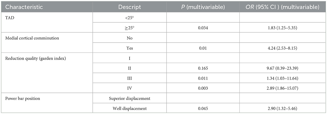 Univariate analysis identified five potential risk factors: TAD (P = 0.001), medial cortical comminution (P = 0.002), injury mechanism (P = 0.194), reduction quality (P < 0.001), and power bar position (P = 0.001; Table 5). Multivariate logistic regression analysis showed that TAD (OR 10.59, 95% CI 2.58–43.51, P = 0.001), medial cortical comminution (OR 11.74, 95% CI 2.38–57.84, P = 0.002), reduction quality (III) (OR 14.25, 95% CI 1.31–155.23, P = 0.029), reduction quality (IV) (OR 76.00, 95% CI 6.75–855.89, P < 0.001), and power bar position (well displacement) (OR 9.00, 95% CI 2.37–34.12, P = 0.001) were all independent significant predictors of postoperative complications (Table 6).