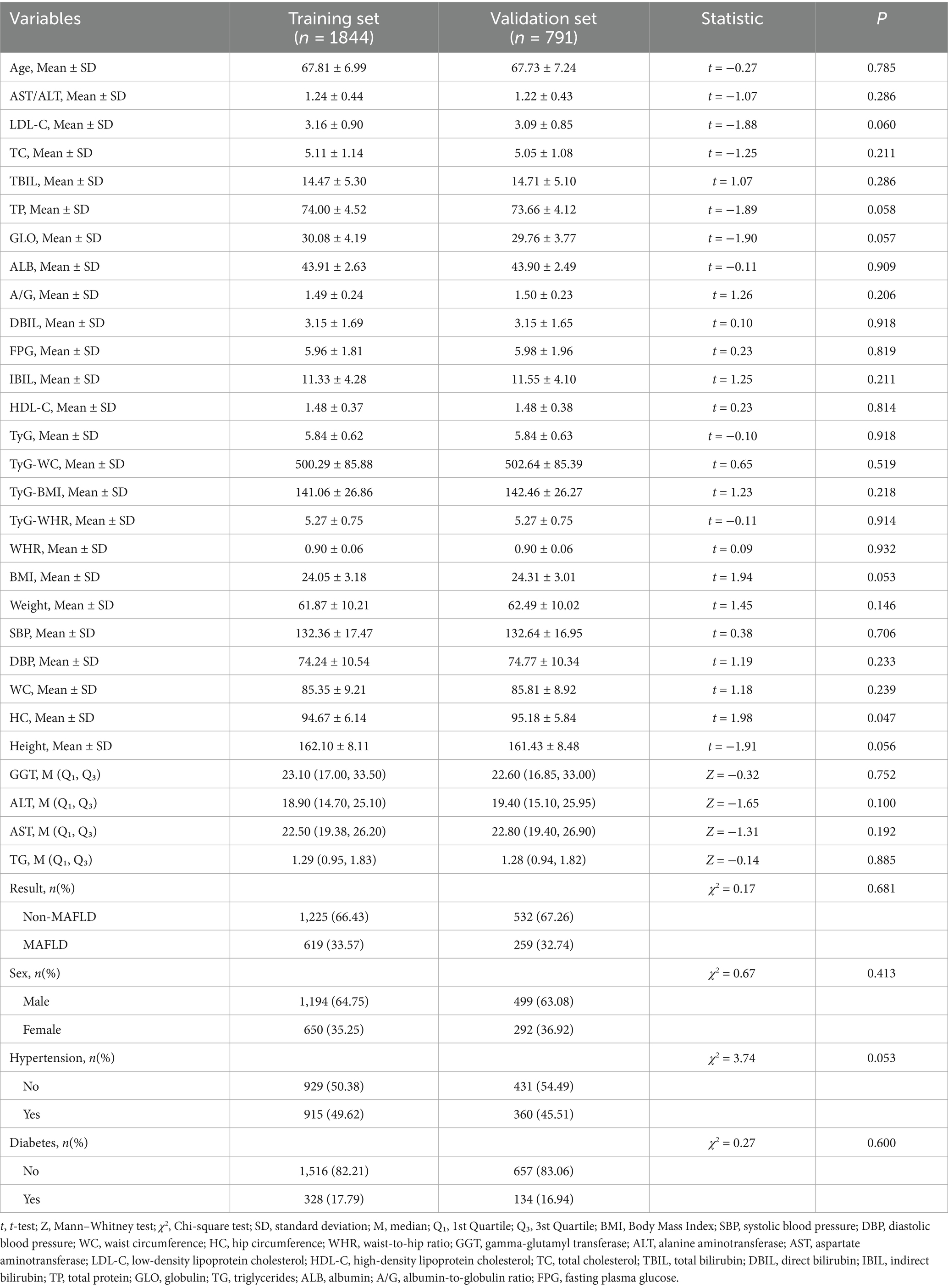 All older adults were randomly divided into a training set (n = 1844, 70%) and a validation set (n = 791, 30%). Except for the variable hip circumference, no statistically significant differences were observed in baseline characteristics between the two groups (p > 0.05), indicating a balanced distribution of covariates (Table 1 and see Supplementary Material 1 for detailed information). Among the participants in the training set, 619 were diagnosed with MAFLD, yielding a prevalence rate of 33.57%. Significant differences in baseline characteristics were found between the MAFLD and non-MAFLD groups. Older adults with MAFLD exhibited notably abnormal metabolic indicators, including elevated levels of blood glucose, blood lipids, BMI, and liver function markers. Moreover, the prevalence of hypertension and diabetes was significantly higher in the MAFLD group compared to the non-MAFLD group (Table 2).