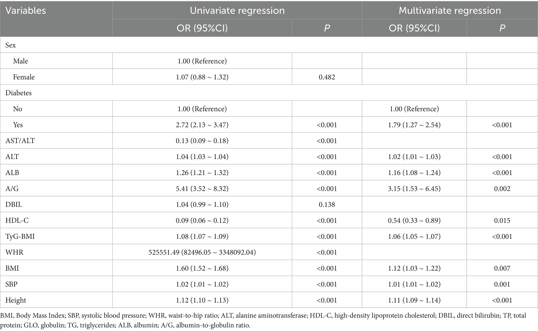 Based on cross-validation of the least absolute shrinkage and selection operator (LASSO) regression, two regularization parameters (λ) were determined: λ.min (0.002995174) and λ.1se (0.01101739). To achieve an optimal balance between model complexity and predictive accuracy, λ.1se (0.01101739)—which corresponded to the minimum cross-validation error—was selected as the optimal parameter. A total of 13 predictors were initially selected in the training set: sex, diabetes, AST/ALT, ALT, ALB, A/G, DBIL, HDL-C, TyG-BMI, WHR, BMI, SBP, and height. The LASSO selection process is illustrated in Figure 2. Subsequently, univariate and multivariate logistic regression analyses were performed to further refine the variable selection, and 9 independent predictors were ultimately identified: diabetes, ALT, ALB, A/G, HDL-C, TyG-BMI, BMI, SBP, and height (Table 3). Variance inflation factor (VIF) values were calculated for all variables, with all values below 5, indicating the absence of multicollinearity among predictors.