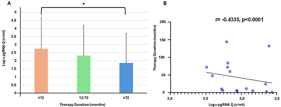 Figure 1. (A) Relation between therapy duration stages and pgRNA Q; ≤12 months vs. 12–72 months, (p-value = 0.058 > 0.05), 12–72 months vs. ≥ 72 months (p-value = 0.577 > 0.05), ≤12 months vs. ≥ 72 months (p-value = 0.021 < 0.05*), (B) Correlation of Therapy duration to the pgRNA quantitative levels in serum, depicts a strong negative assumption about the decline of pgRNA levels as the years of therapy are being increased, Spearman r = −0.4335, p < 0.0001.