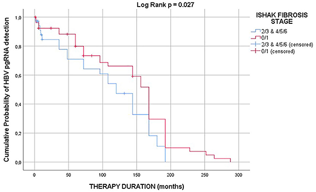 Figure 2. Kaplan-Meier curves depicting the cumulative probability of detection of HBV pgRNA vs. duration of therapy; detection of HBV pgRNA is prolonged (p = 0.027) in patients with Ishak fibrosis stage 0–1 (median HBV pgRNA survival 168 months; 95% CI: 157–179), when compared with patients with Ishak fibrosis stage 2–3 and 4–6 (median HBV pgRNA survival 120 months; 95% CI: 89–151).