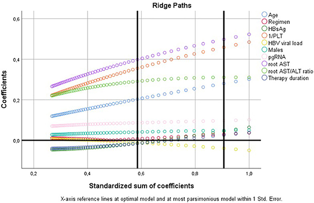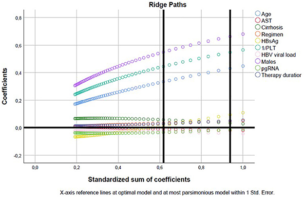 Graph depicting ridge paths with standardized sum of coefficients on the X-axis and coefficients on the Y-axis. Colored lines represent different variables: age, AST, cirrhosis, regimen, HBsAg, platelet count, HBV viral load, gender, pgRNA, and therapy duration. Vertical lines indicate reference points referring to optimal and parsimonious models within one standard error.