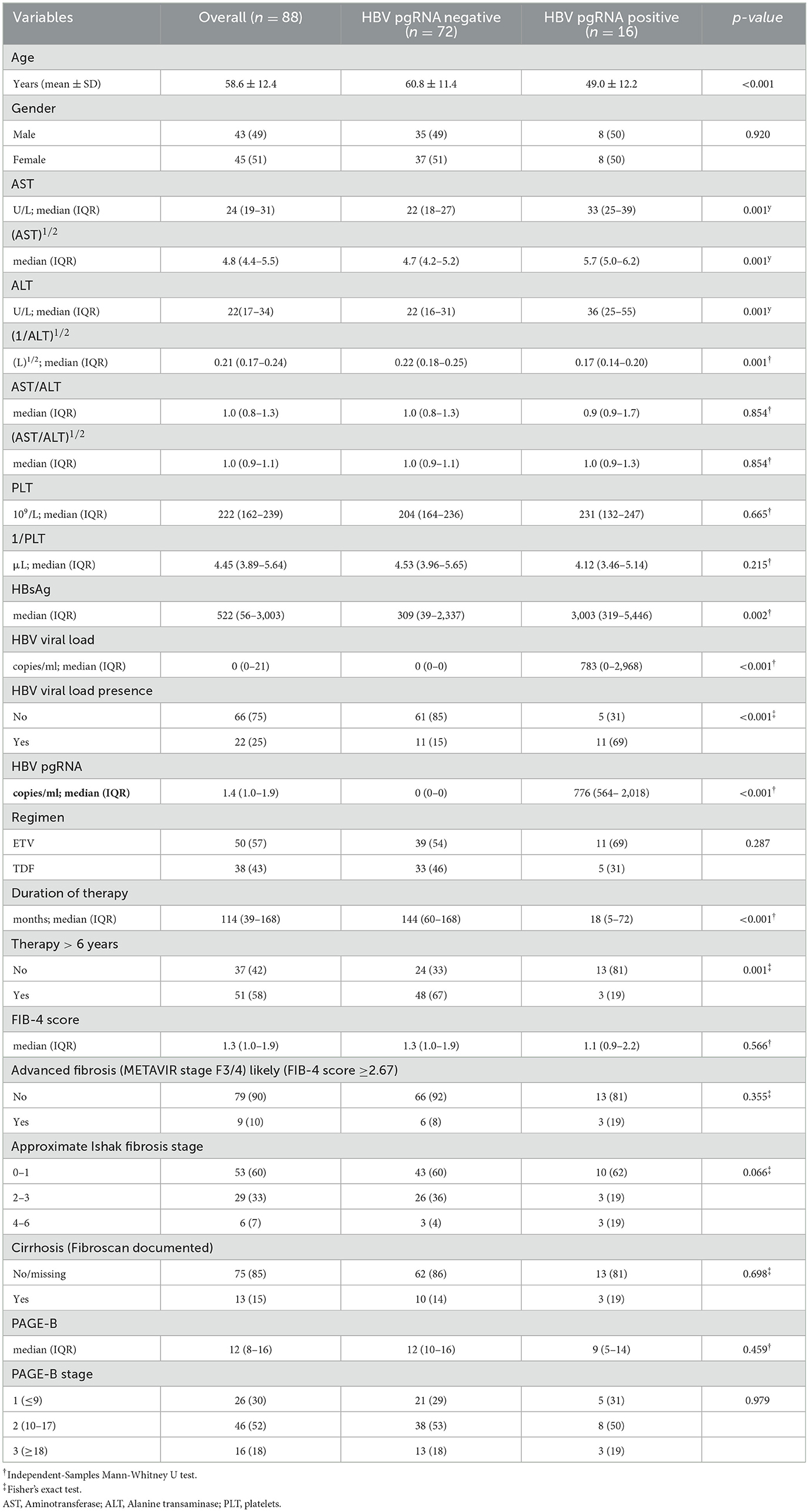 Table 1. Patients' characteristics according to HBV pgRNA status.