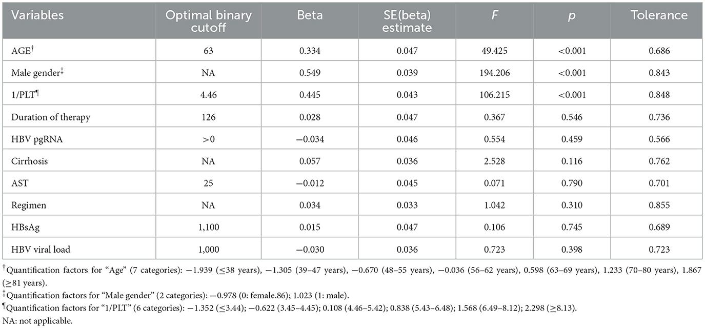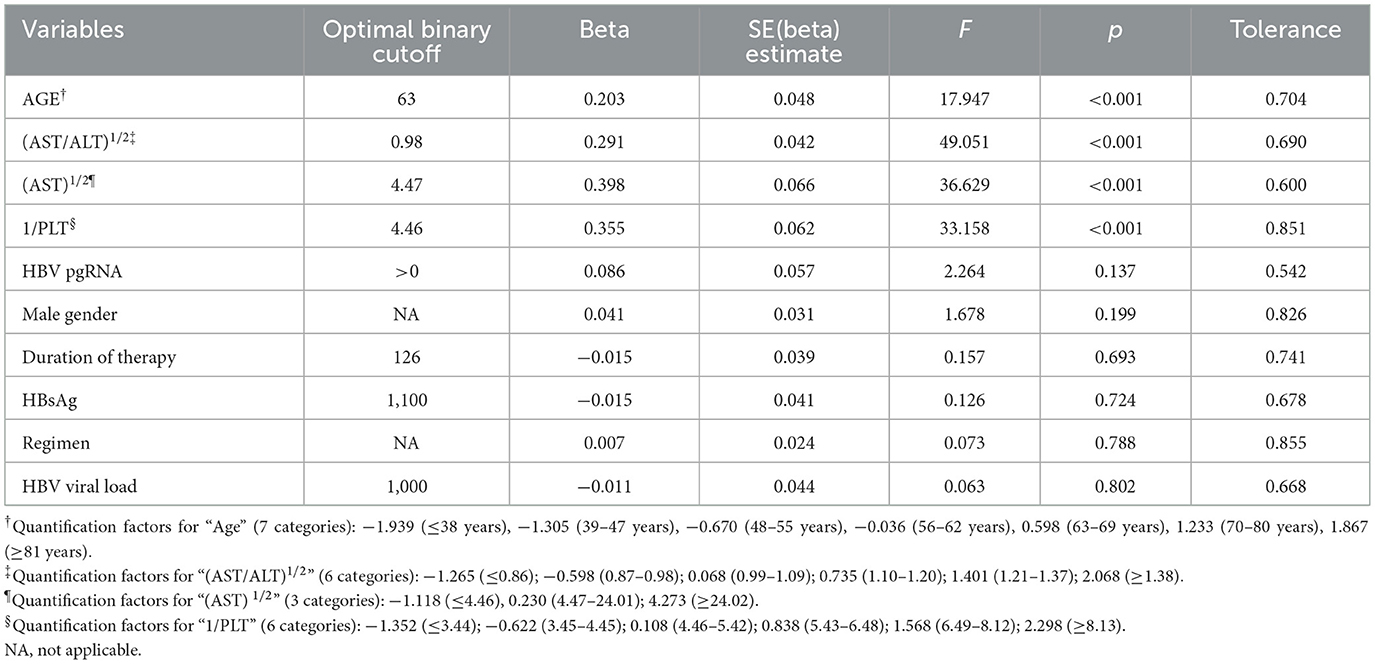 Table 2. Categorical regression model assessing the potential value of HBV pgRNA as prognosticator of FIB-4 using categorical regression after using maximal discretization, ridge regression regularization, and 10× cross-validation.