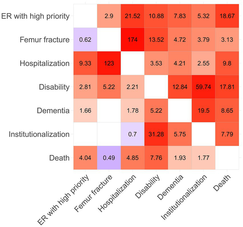 Emergency room (ER) access, particularly for urgent cases (high priority), is a critical outcome in older adults (47). These visits often result from falls, exacerbation of chronic diseases, or sudden onset of severe symptoms (48). Emergency room access in high priority (ER-HP) cases among older adults typically involve life-threatening conditions such as stroke, heart attack, or severe trauma (49). However, even non-high-priority ER visits in frail older adults can indicate declining health and increased vulnerability (50). Furthermore, the period immediately after discharge from the ER is particularly critical, with a high risk of medication errors, falls, and exacerbation of chronic conditions (51). Finally, stress and disorientation associated with an emergency department visit can lead to delirium or cognitive decline in some frail older adults, underscoring the need for careful post-ER monitoring and support (52).
