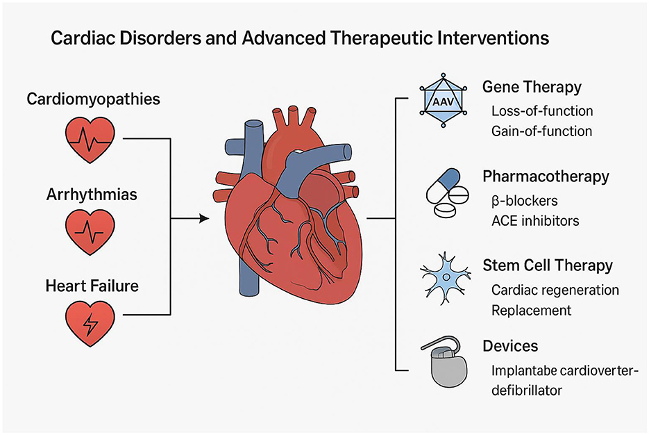 Inherited and acquired cardiac diseases, such as arrhythmogenic cardiomyopathy and myocardial infarction (MI), remain leading contributors to heart failure and cardiovascular mortality globally (1). Despite the currently available pharmacological agents like β-blockers and ACE inhibitors, and device-based interventions such as pacemakers and defibrillators, the long-term management of these conditions still remains suboptimal for many patients due to limited efficacy, adverse effects, or progression to end-stage heart failure necessitating urgent need for alternative therapeutic agents (2) (Figure 1).