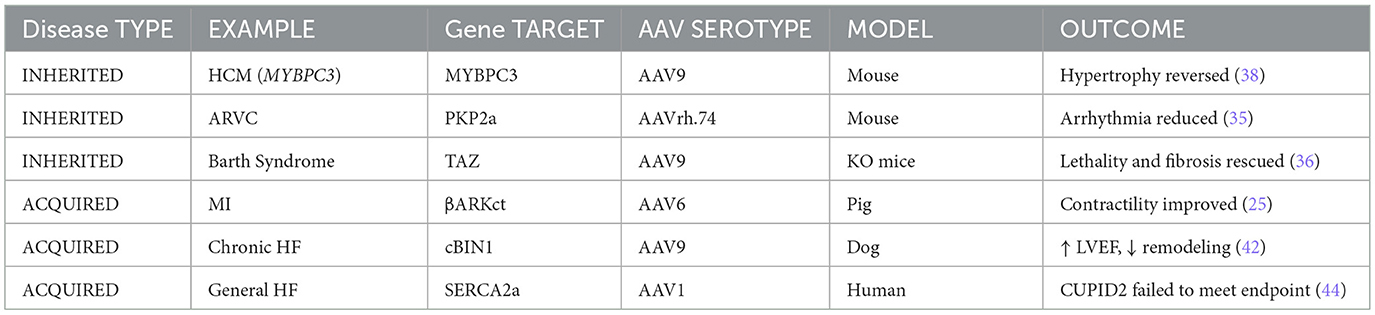 Preclinical studies: adeno-associated virus (AAV)-based gene therapies have shown considerable promises across a wide range of cardiovascular diseases. These disorders can be broadly classified into inherited (genetically driven) and non-inherited or acquired (typically secondary to ischemic, metabolic, or pressure-related injury). While both categories can benefit from gene modulation strategies, the therapeutic targets, vector choice, and delivery mechanisms often differ. This section explores the specific serotype-gene combinations that have shown efficacy in preclinical or clinical models for each category.