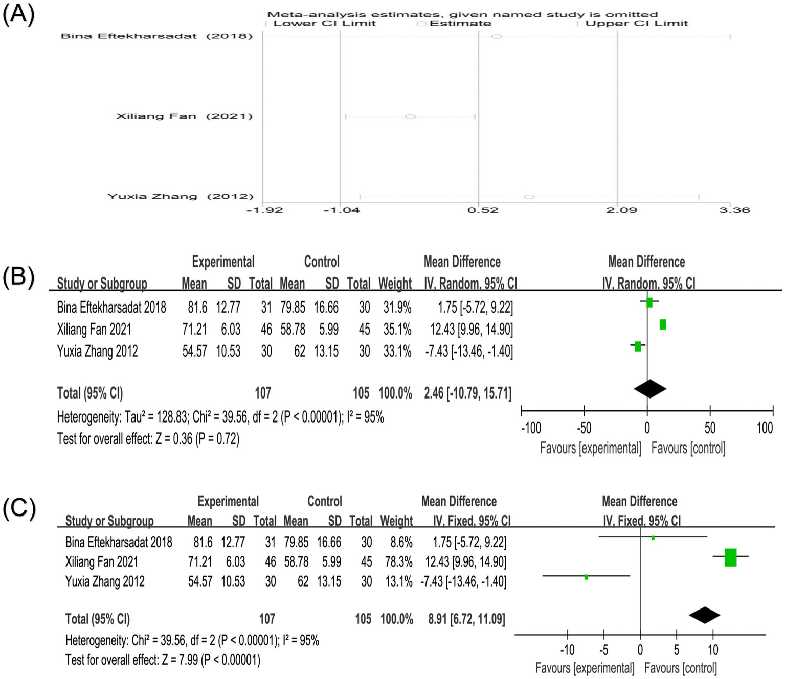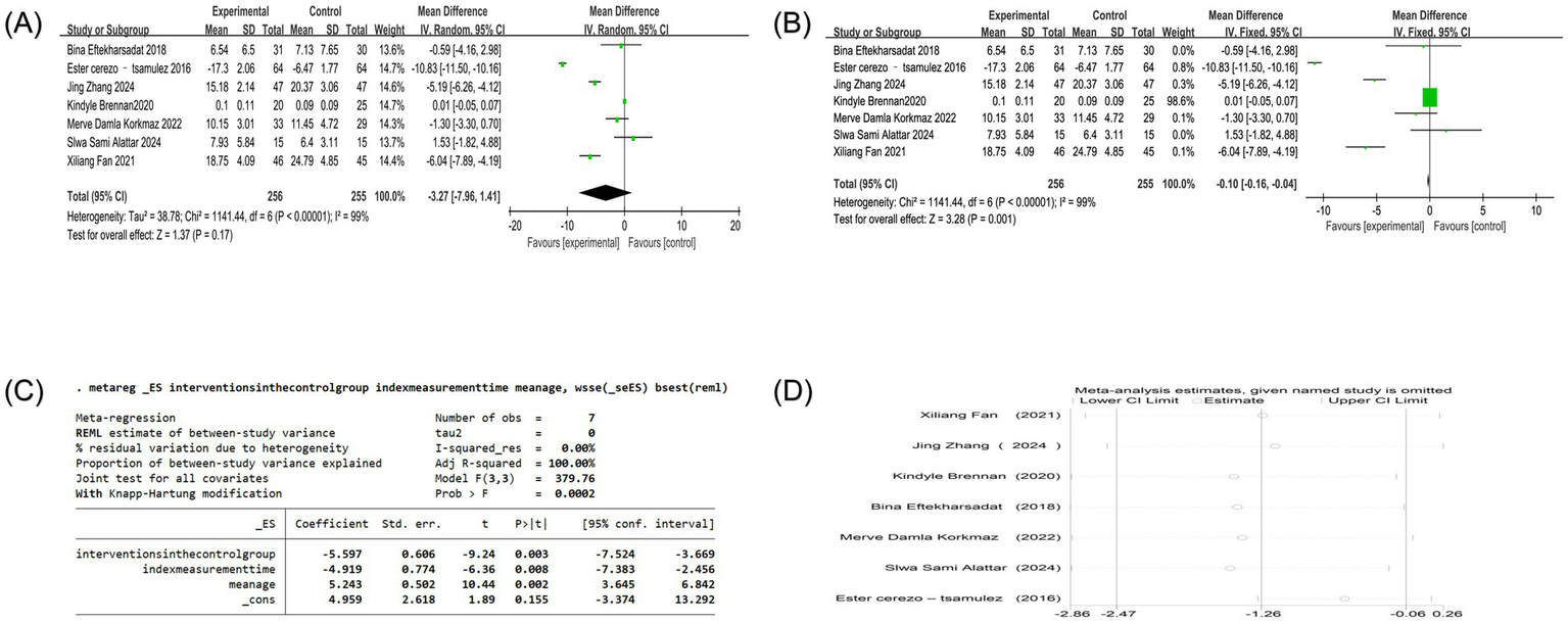 (A) Forest plot of VAS score of nape dorsal MPS treated by acupuncture combined therapy (random-effects model); (B) forest plot of VAS score of nape dorsal MPS treated by acupuncture combined therapy (fixed-effects model); (C) meta regression of VAS score of nape dorsal MPS treated with acupuncture combined therapy; (D) sensitivity analysis of VAS score of nape dorsal MPS treated with acupuncture combined therapy.