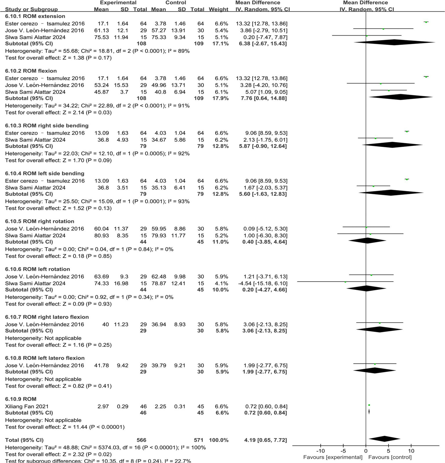The systematic review incorporated 21 randomized controlled trials with a pooled cohort of 1,630 patients. ➀ Meta-analysis revealed that compared with control groups, acupuncture combined therapy can improve Visual Analogue Scale (VAS); score [standardized mean difference (SMD) = −1.51, 95% confidence interval (CI) (−2.12, −0.90), p < 0.00001], clinical effective rate [relative risk (RR) = 1.15, 95%CI (1.1, 1.2), p < 0.00001], Range of Motion (ROM); flexion [MD = 7.76, 95%CI (0.64, 14.88), p = 0.03], Pain Rating Index (PRI) score [MD = −0.45, 95%CI (−0.52, −0.38), p < 0.00001], and Oswestry score [MD = −0.30, 95%CI (−0.59, −0.01), p = 0.05]. ➁ Subgroup analysis indicated that acupuncture combined therapy demonstrated greater efficacy in pain reduction and cervical dysfunction improvement for patients with a mean age>35 years. ➂ Publication bias analysis identified potential bias for the VAS score and clinical effective rate, which may affect the reliability of VAS conclusions but not the clinical effective rate.