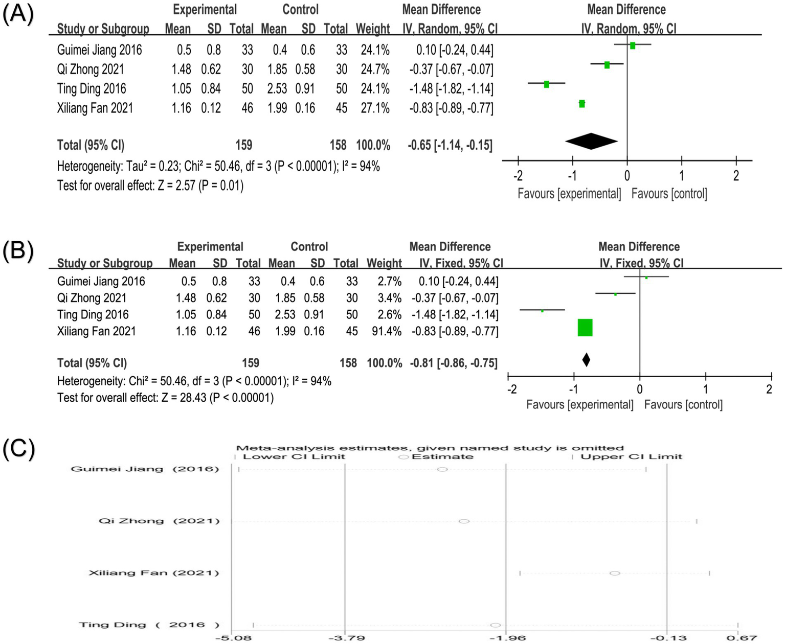 | Western medicine | 2 | 76 | 75 | 96 | <0.00001 | −1.52 (−3.42, 0.38) | 0.12 | Random |