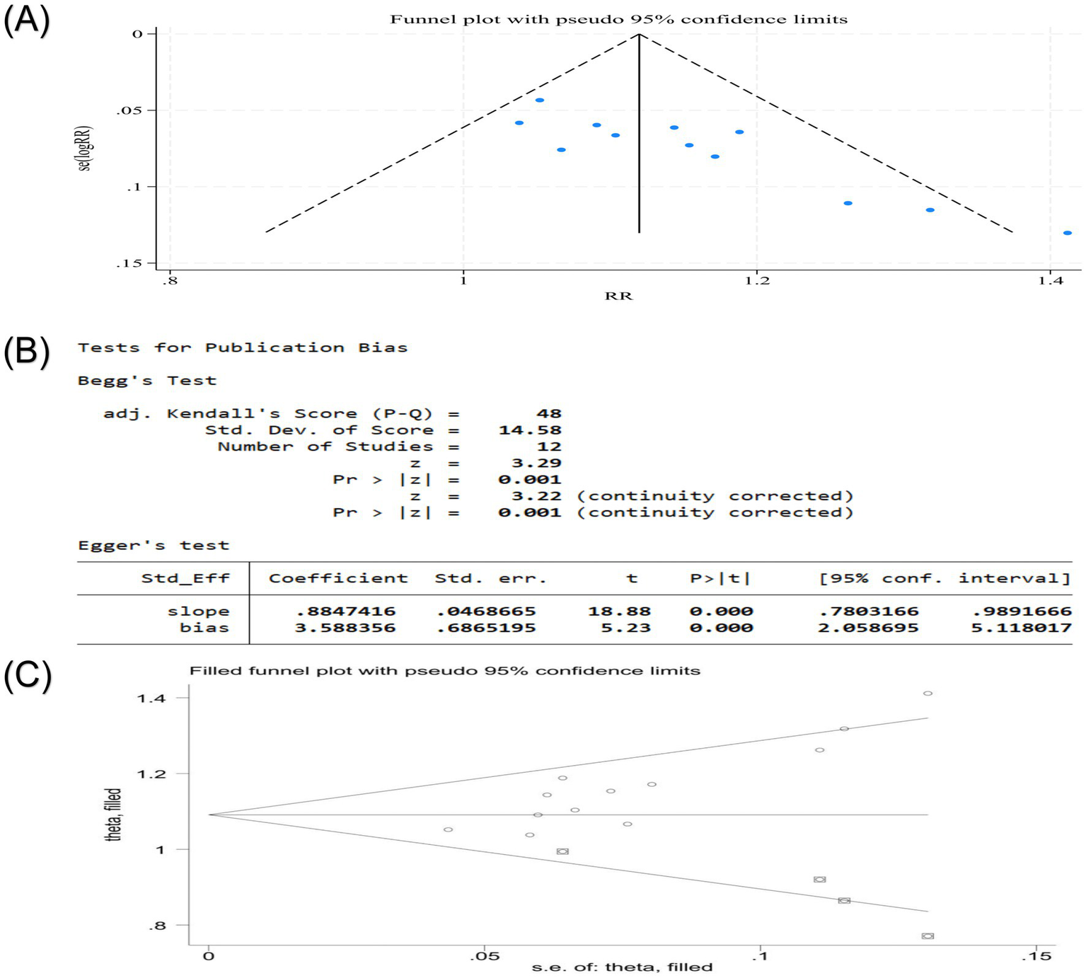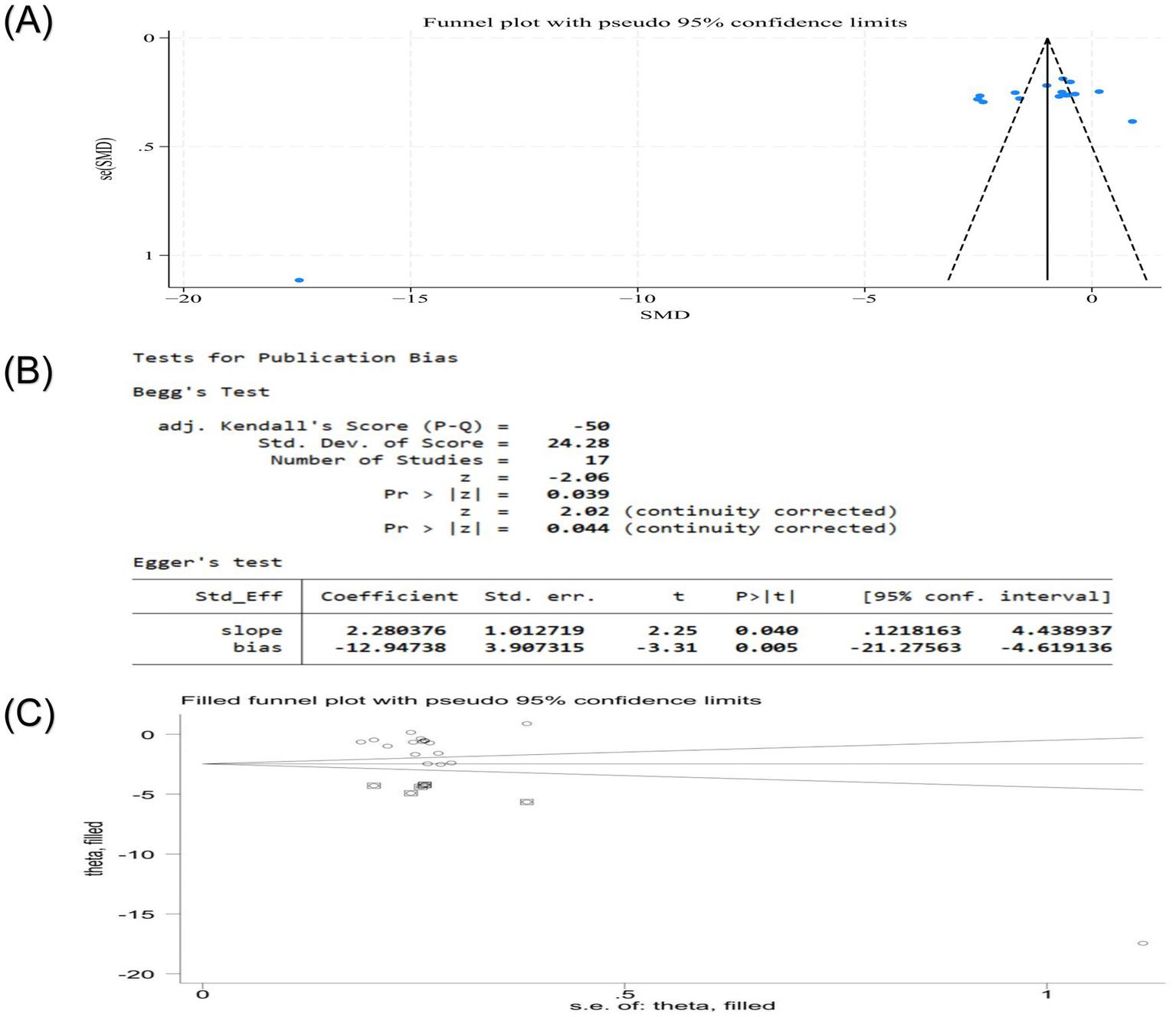 Statistical analyses were executed utilizing RevMan 5.4, Stata 18, and Stata 15 software. RevMan was used primarily for meta-analysis and the generation of forest plots. At the same time, Stata was used for additional statistical assessments, including funnel plot construction, meta-regression analysis, Egger’s and Begg’s tests, and the trim-and-fill analysis. Binary variables underwent the relative risk (RR) to calculate the effect size, while continuous variables used either mean difference (MD) or standardized mean difference (SMD), both of which took 95%CI. The statistical significance threshold was determined at a p-value of <0.05 (15). Heterogeneity assessments applied random-effects models when I2 > 50%; conversely, fixed-effects models were used below this benchmark. Potential heterogeneity sources, including variations in intervention protocols and time, were investigated through subgroup stratification and sensitivity. Sensitivity analysis verified the robustness of the combined results by eliminating each study one by one. Potential publication bias was evaluated by plotting funnel plots and combining Egger’s test and Begg’s test. The outcome indicators that may have publication bias were used to verify the robustness of the outcome using the trim-and-fill method. The significance threshold for publication bias was set at a p-value of <0.05 (16).