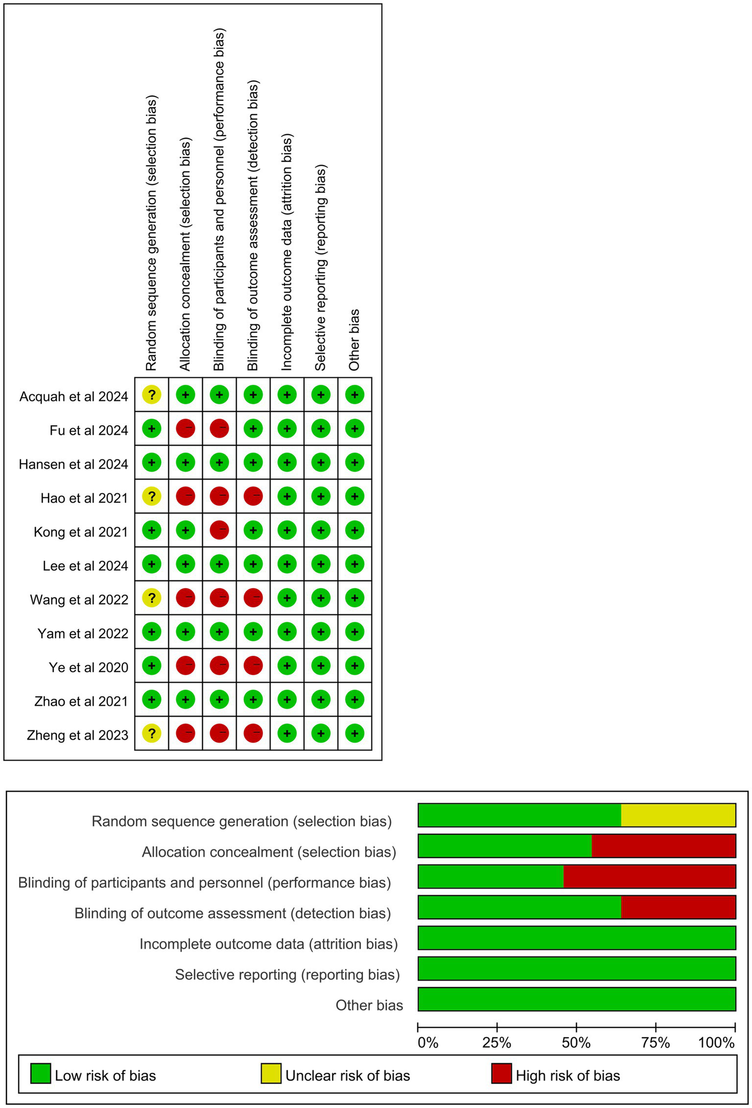The quality of the included RCTs was assessed using the risk-of-bias tool developed by the Cochrane Collaboration. This tool encompasses the following seven distinct domains: generation of random sequences, concealment of allocation, blinding of both participants and personnel, blinding of outcome evaluation, incomplete data regarding outcomes, selective reporting, and the presence of other biases. Two reviewers evaluated the potential for bias across each domain, classifying it into three categories as follows: “low,” “high,” or “unclear.”