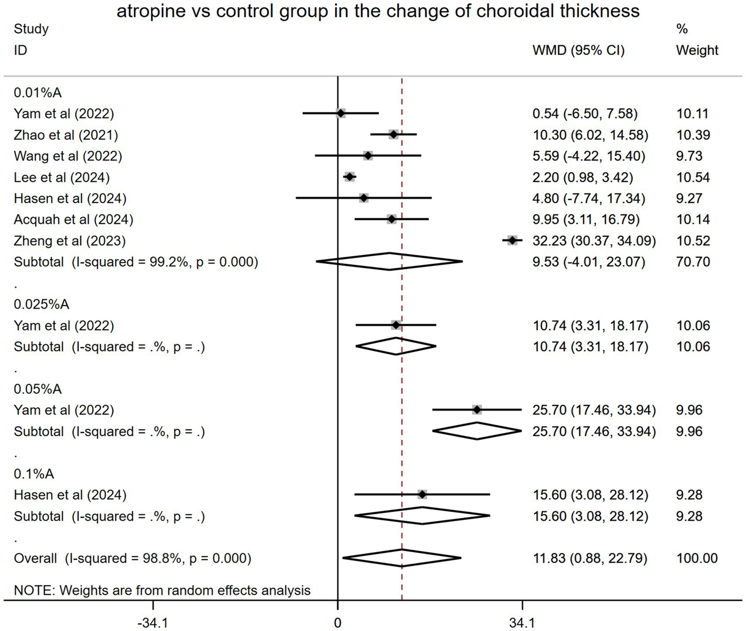 Figure 3. Changes observed in choroidal thickness in the subgroup analysis in the atropine versus control group. A, atropine, WMD, weighted mean difference.