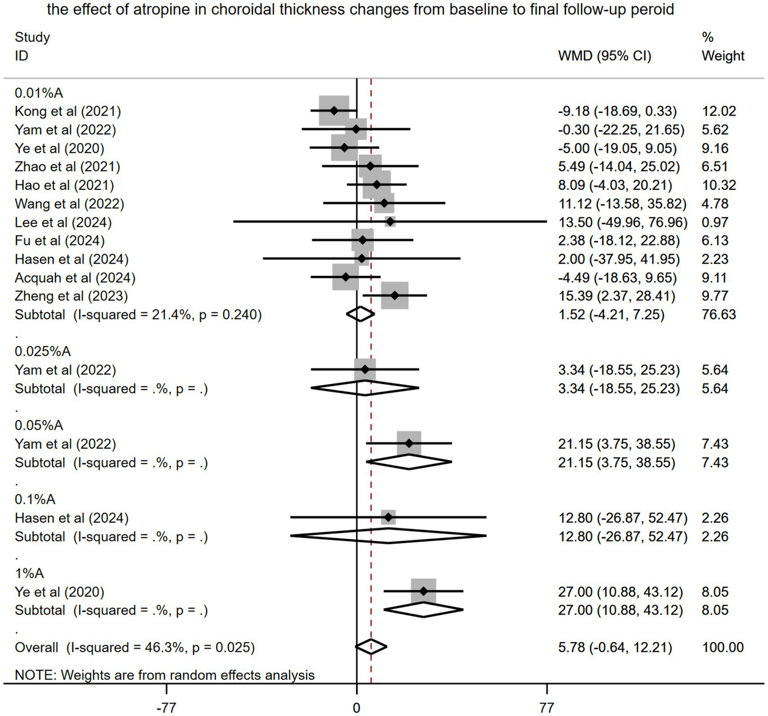 Figure 4. Effects of atropine on changes in choroidal thickness among children with myopia from baseline to the final treatment period (self-control). A, atropine, WMD, weighted mean difference.