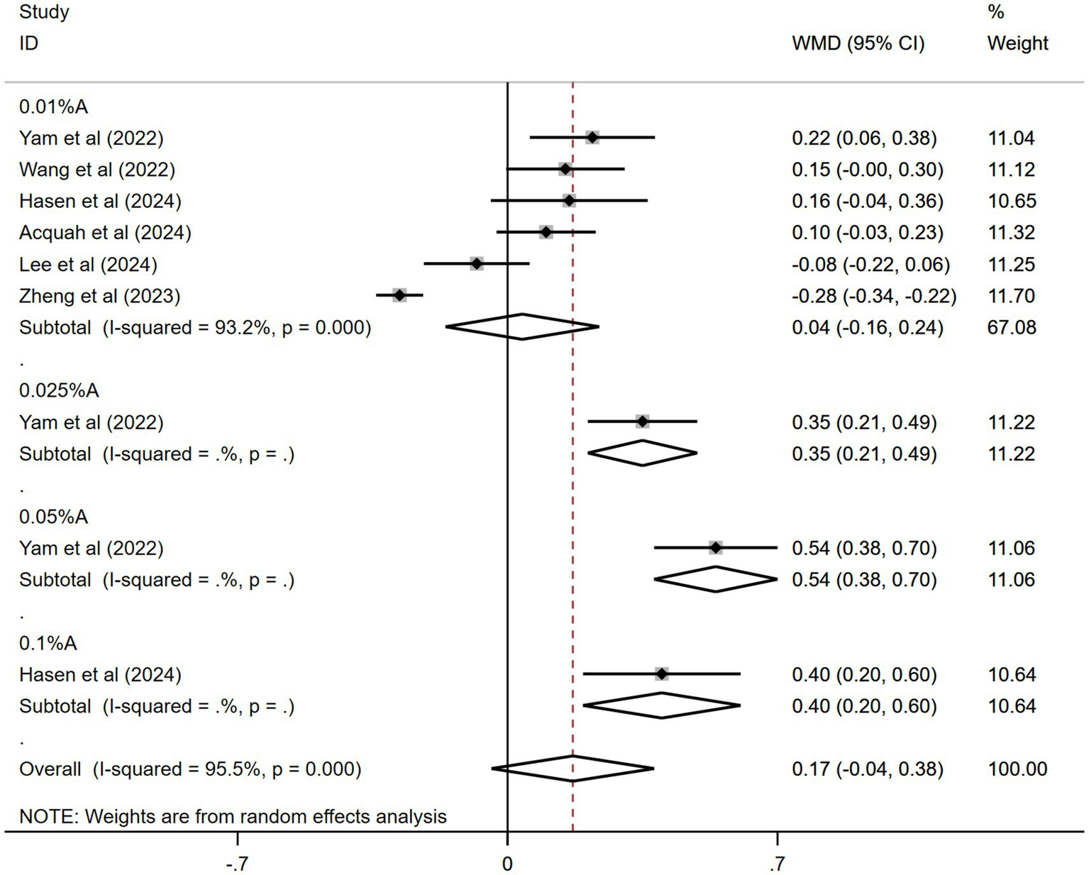 Subgroup analysis of the pooled results revealed that various concentration of atropine differed in their impact on patient outcomes (WMD: 1.52 μm, 95% CI: −4.21 to 7.25 μm for 0.01% atropine, WMD: 3.34 μm, 95% CI: −18.55 to 25.23 μm for 0.025% atropine, WMD: 21.15 μm, 95% CI 3.75–38.55 μm for 0.05% atropine, WMD: 12.80 μm, 95% CI: −26.87 to 52.47 μm for 0.1% atropine, and WMD: 27.0 μm, 95% CI: 10.88–43.12 μm for 1% atropine). However, only 0.05 and 1% atropine had a significant effect on ChT.