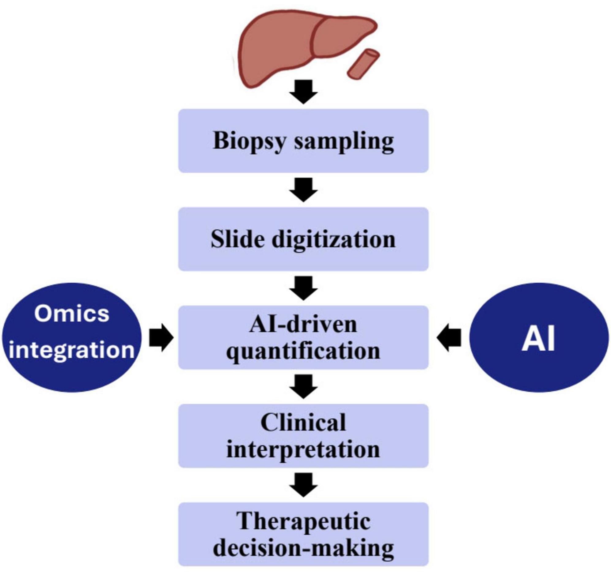 Traditional histopathology captures architectural and cytological context, while artificial intelligence (AI) quantifies patterns beyond human perception and multi-omics reveals molecular pathways underpinning those features (196, 199, 200). When combined, these layers transform liver biopsy from a purely morphological tool into a multidimensional diagnostic platform. For instance, AI-quantified fibrosis metrics can be directly correlated with transcriptomic and proteomic profiles to stratify patients by molecular subtype and treatment response (201, 202). This integrative model supports a precision-hepatology paradigm where histological, digital, and molecular data converge to inform individualized management (196, 202).