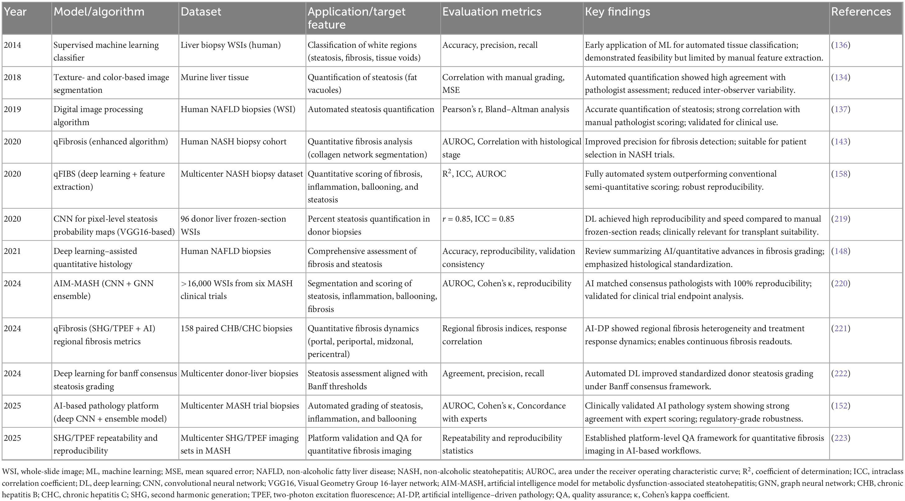 This study developed and validated an AI model to quantify large droplet fat and fat-induced artifact (FIA)/lipopeliosis on preimplantation liver frozen sections, aiming to improve assessment of steatosis, which is linked to delayed graft function. Applied to 161 liver transplant cases, the AI model’s steatosis measurements correlated with early allograft dysfunction, respiratory failure, and advanced fibrosis, but not with overall graft or patient survival. Interestingly, FIA/lipopeliosis levels were associated with graft and patient survival. These findings suggest AI-assisted evaluation may enhance prediction of post-transplant outcomes (154). This study applied an AI system using SHG/two-photon-excited fluorescence (TPEF) imaging to evaluate hepatic steatosis in six MASLD mouse models. While traditional NASH CRN histological scoring failed to detect changes between 8 and 16 weeks, the AI tool objectively quantified dynamic alterations in the area, number, and size of steatotic regions. These results suggest that AI analysis offers a more accurate and sensitive method for assessing steatosis progression in preclinical MASLD models, improving the evaluation of experimental and therapeutic interventions (155).