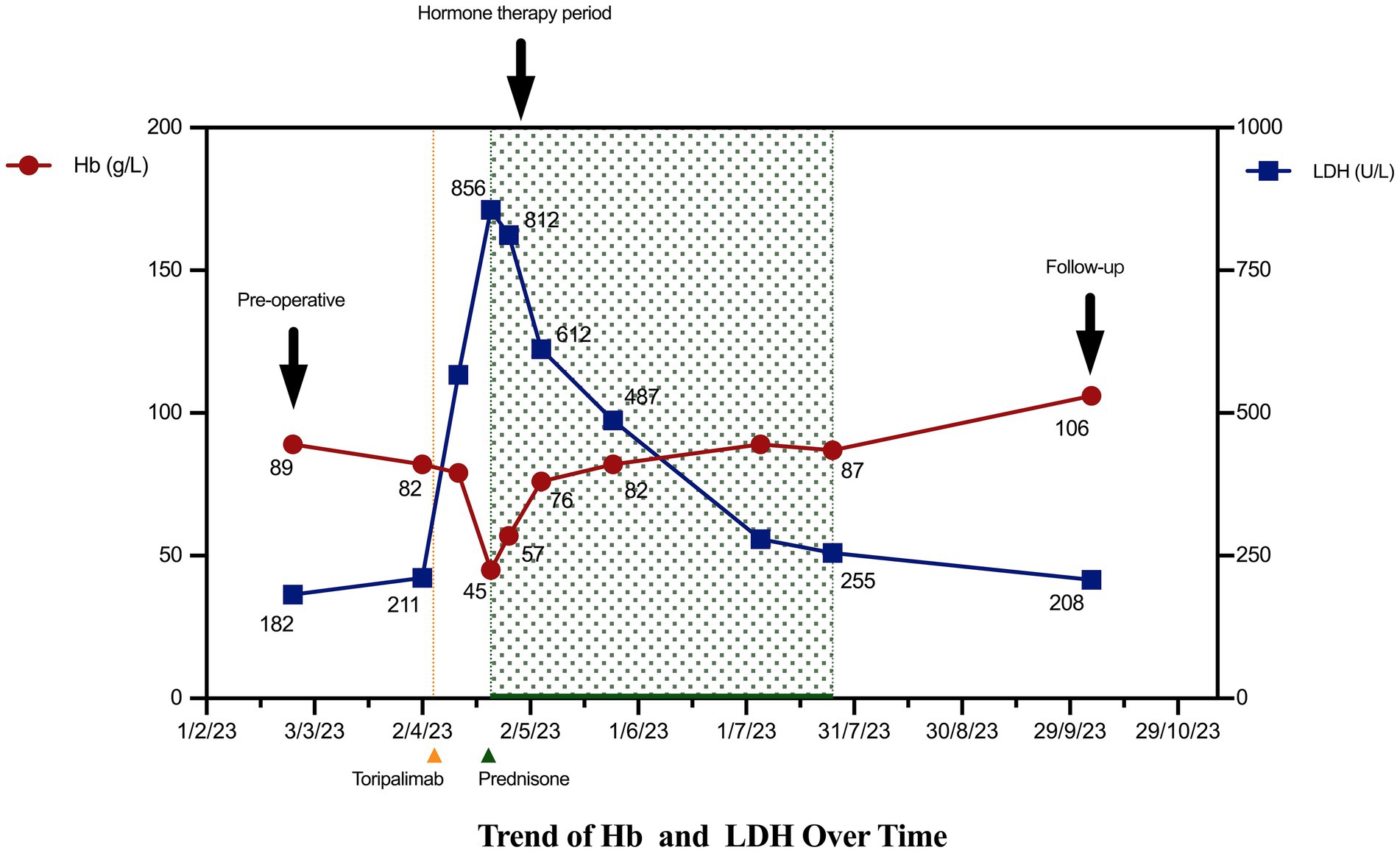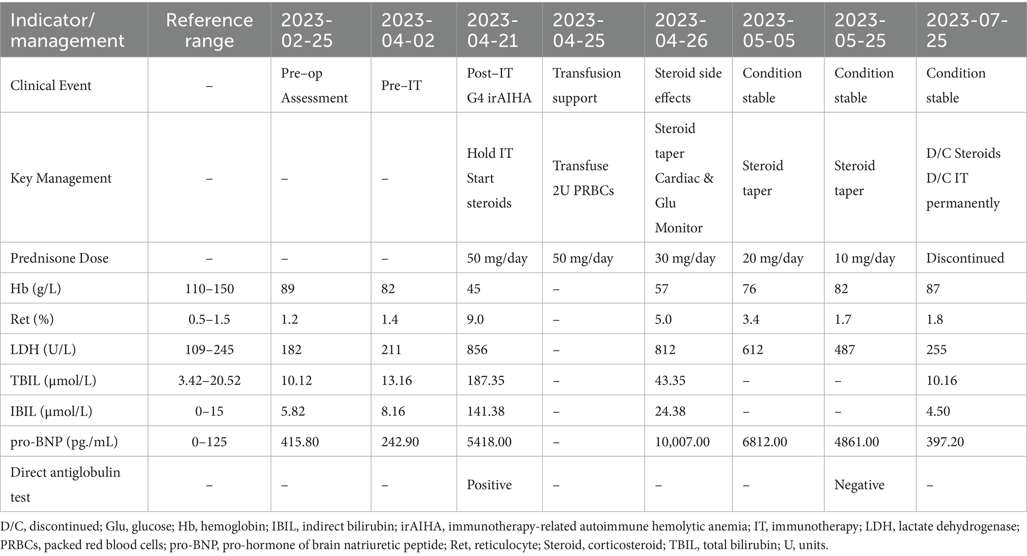 Following the diagnosis of grade 4 irAIHA on April 21, 2023, after toripalimab had been administered, immunotherapy was immediately discontinued in favor of oral prednisone at an initial dose of 50 mg daily. The patient received a transfusion of two units of type B-positive packed red blood cells on April 25, 2023. Follow-up on April 26, 2023, showed that the patient’s Hb level had risen to 57 g/L with a Ret% of 5%, indicating initial control of the hemolytic anemia. However, the high-dose corticosteroid therapy also induced significant adverse effects: the patient’s pro-B-type natriuretic peptide level increased significantly to 10,007 pg./mL, indicating increased cardiac load. The patient’s blood glucose level also became poorly controlled, with fasting levels peaking at 23 mmol/L. To balance the treatment efficacy with drug toxicity, the prednisone dose was reduced to 30 mg daily on April 26, 2023, alongside intensified monitoring of cardiac function and glycemic control. Subsequent assessments confirmed stable Hb levels, and the patient’s cardiac condition was managed using supportive treatment. Following an increase in the patient’s Hb level to 76 g/L on May 5, 2023, the prednisone dose was cautiously reduced further to 20 mg daily. Notably, the patient did not receive any other adjunctive therapies aimed at correcting her anemia, such as intravenous iron supplementation or erythropoiesis-stimulating agents, during the treatment course.
