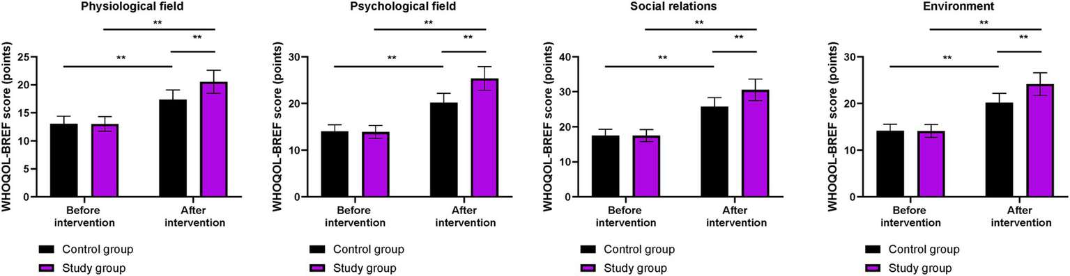Before the intervention, the WHOQOL-BREF scores for physiological field, psychological field, social relations, and environment did not differ significantly between the two groups (p > 0.05). After the intervention, the WHOQOL-BREF scores in both groups were higher than those before the intervention (p < 0.01). More importantly, compared to the control group, the WHOQOL-BREF scores were higher in the study group after the intervention (p < 0.01, Figure 5).