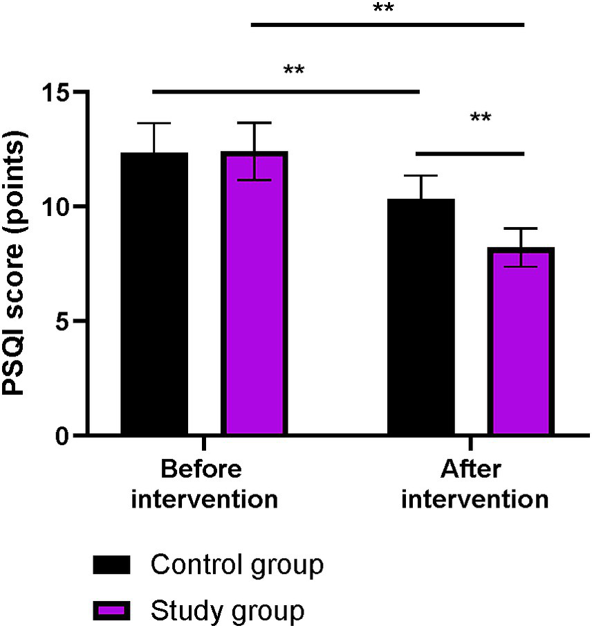 Before the intervention, the PSQI score did not differ significantly between the two groups (p > 0.05). After the intervention, the PSQI scores in both groups were lower than those before the intervention (p < 0.01). More importantly, compared to the control group, the PSQI score was lower in the study group after the intervention (p < 0.01, Figure 6).