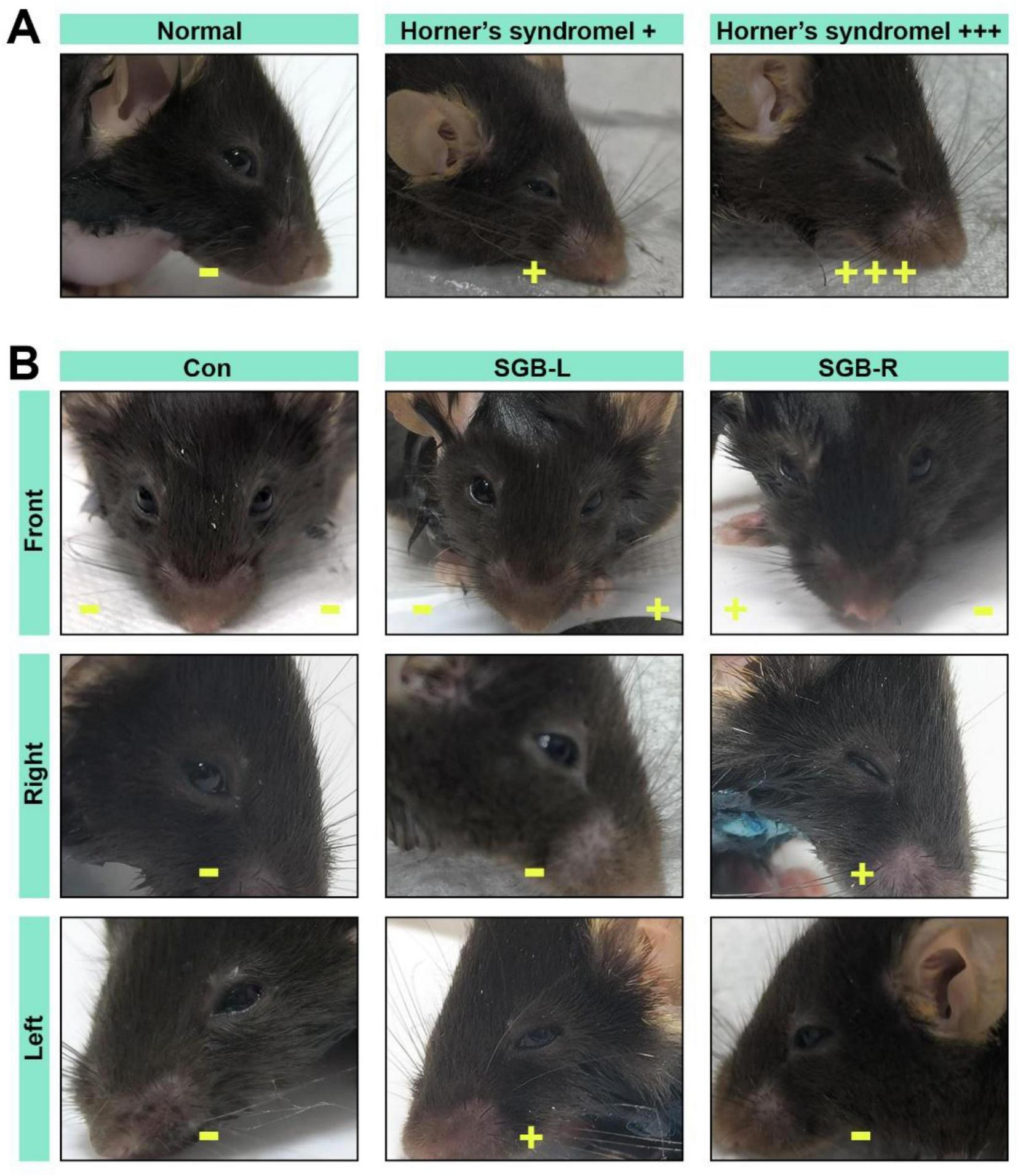 Horner’s syndrome. (A) Diagram illustrating the eyes of C57BL/6 mice in normal and Horner’s syndrome states. (B) Images of Horner’s syndrome from the front, right, and left sides following stellate ganglion block (SGB) under ultrasound guidance in the Con, SGB-L, and SGB-R groups. –No ptosis, +mild ptosis, + + +severe ptosis.
