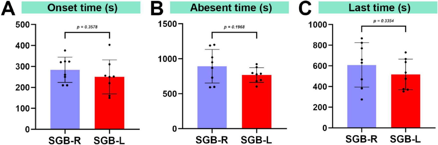 Upon cessation of isoflurane, the surviving mice reawakened within 160 s. Horner’s syndrome symptoms were first observed in the SGB-right mice at 284.1 ± 60.43 s and in the SGB-left mice at 250.1 ± 81.11 s post-arousal. No signs of Horner’s syndrome were observed in the SGB Con group. The experimental group demonstrated a 100% occurrence rate of Horner’s syndrome, with the incidence rates of mild (+) and severe (++/+++) eyelid ptosis being 6.2% and 93.8%, respectively. No statistically significant differences were detected in either the incidence or duration of eyelid ptosis between the SGB-R and SGB-L groups (Figures 3A–C and Table 1).