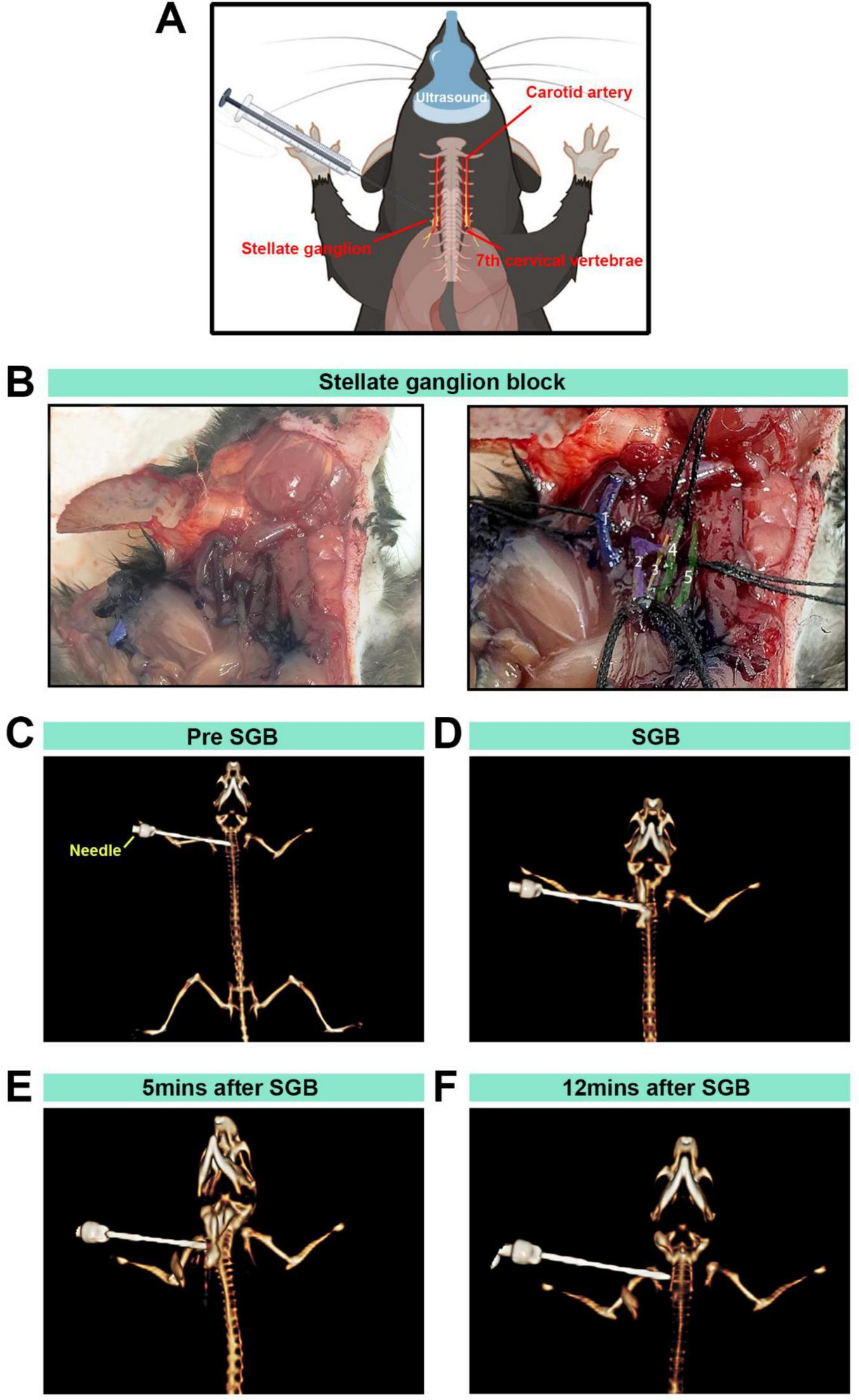 It is crucial to acknowledge the limitations of our study. First, Although ultrasound allows clear identification of the key anatomical landmarks surrounding the SG, the SG itself cannot be directly visualized or accurately localized. Second, ultrasound-guided SGB surgeries require high-frequency ultrasound equipment, which reduces their portability compared with blind detection methods. Third, a change in facial temperature is a classic sign of stellate ganglion block; however, because mice have small faces that are covered in fur, accurate measurement of facial temperature is challenging. Therefore, the temperature at the distal extremities was used as a substitute. Fourth, The post-SGB time points (5 and 12 min) were chosen based on preliminary data showing peak contrast distribution at 5 min and resolution by 12 min. However, dynamic, real-time tracking of contrast diffusion was not possible due to CT setup limitations. Although cross-sectional images could enable detailed analysis, they were severely compromised by needle-induced metal artifacts in the small C57BL/6 mice, exacerbated by the spatial resolution limits of our preclinical scanner. Consequently, robust cross-sectional analysis was unfeasible, and we relied on 3D reconstructions for gross localization.