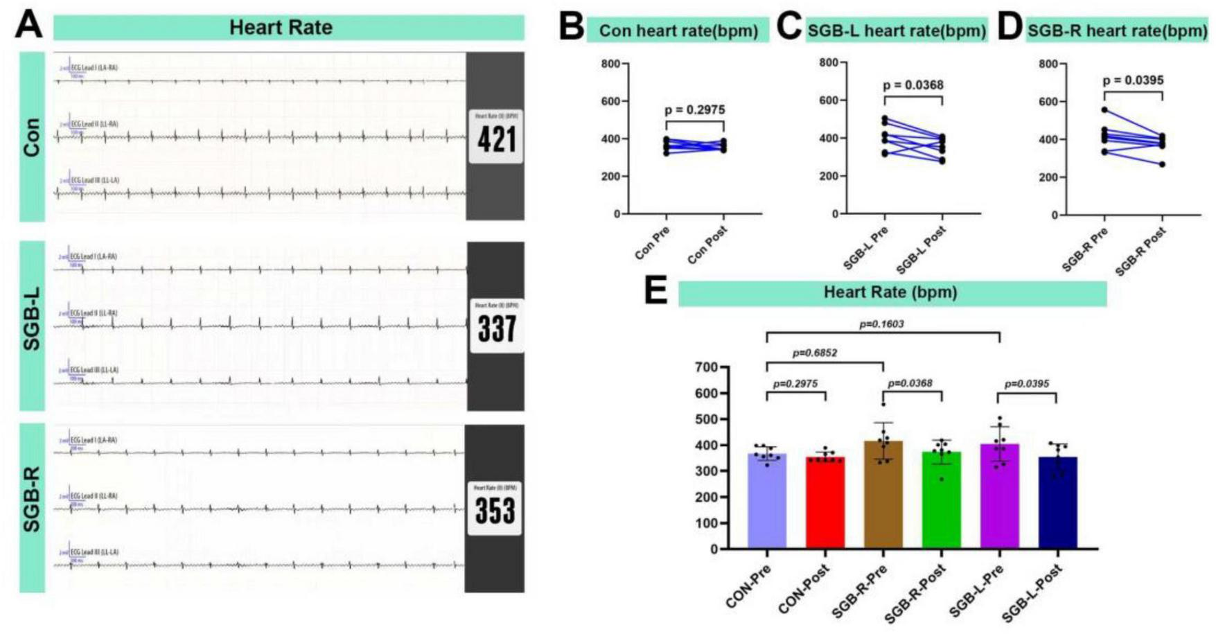 At 20 min after SGB intervention, the heart rates of all surviving mice were evaluated (Figure 5A). There were no significant differences in heart rate before SGB among the Con, SGB-L, and SGB-R groups. Heart rates in the SGB-R-post and SGB-L-post groups were lower compared to SGB-R-pre and SGB-L-pre, and the differences were statistically significant (p < 0.05), while no change was observed in the Con group (Figures 5B–E and Table 2).
