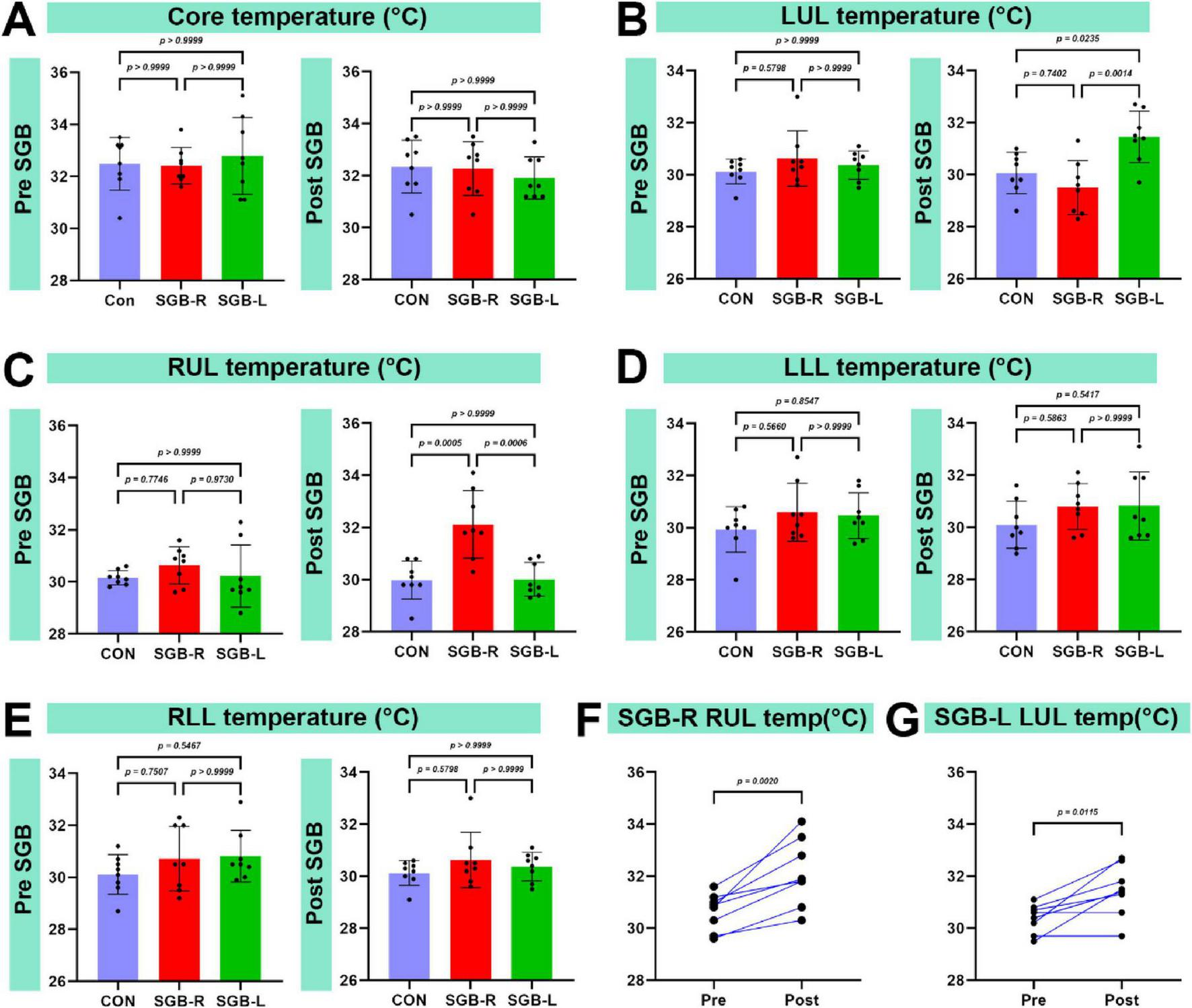There was no significant difference in core temperature among the Con, SGB-R, SGB-L groups (Figure 6A). The temperature of the blocked upper limb was greater in the SGB-R and SGB-L groups than in the Con group (p < 0.05; Figures 6B, C). However, the lower limb temperatures did not differ between the SGB-R and SGB-L groups (Figures 6D, E). Moreover, The temperature of the ipsilateral upper limb (right limb in the SGB-R group, left limb in the SGB-L group) was higher post-SGB than pre-SGB in both the SGB-R and SGB-L groups, and the differences were statistically significant. The temperature of the right upper limb after right-sided SGB was higher than that before the block, and the temperature of the left upper limb after left-sided SGB was higher than that before the block, with a statistically significant difference. (Figures 6F, G).